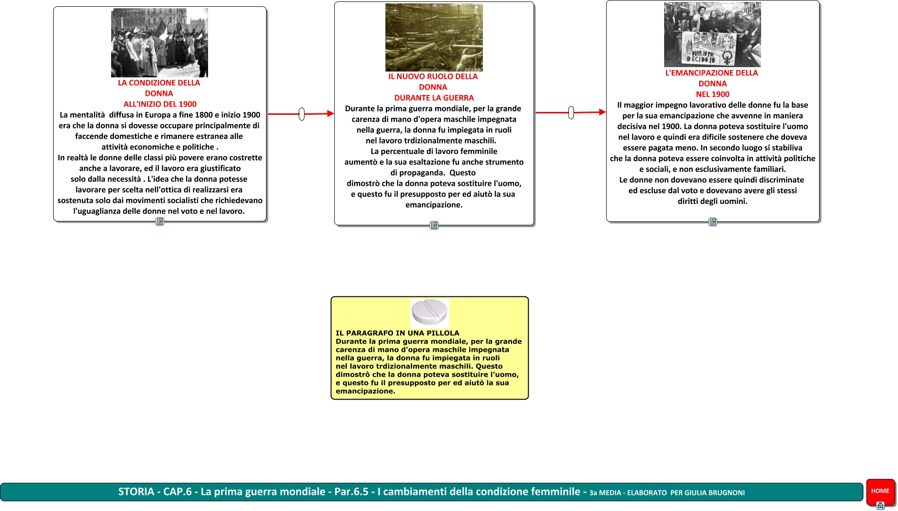 Questa Cmap, creata con IHMC CmapTools, contiene informazioni relative a: STORIA - Par.6.5 - I cambiamenti della condizione femminile - GB 3a media, IL NUOVO RUOLO DELLA DONNA DURANTE LA GUERRA Durante la prima guerra mondiale, per la grande carenza di mano d'opera maschile impegnata nella guerra, la donna fu impiegata in ruoli nel lavoro trdizionalmente maschili. La percentuale di lavoro femminile aumentò e la sua esaltazione fu anche strumento di propaganda. Questo dimostrò che la donna poteva sostituire l'uomo, e questo fu il presupposto per ed aiutò la sua emancipazione. L'EMANCIPAZIONE DELLA DONNA NEL 1900 Il maggior impegno lavorativo delle donne fu la base per la sua emancipazione che avvenne in maniera decisiva nel 1900. La donna poteva sostituire l'uomo nel lavoro e quindi era dificile sostenere che doveva essere pagata meno. In secondo luogo si stabiliva che la donna poteva essere coinvolta in attività politiche e sociali, e non esclusivamente familiari. Le donne non dovevano essere quindi discriminate ed escluse dal voto e dovevano avere gli stessi diritti degli uomini., LA CONDIZIONE DELLA DONNA ALL'INIZIO DEL 1900 La mentalità diffusa in Europa a fine 1800 e inizio 1900 era che la donna si dovesse occupare principalmente di faccende domestiche e rimanere estranea alle attività economiche e politiche . In realtà le donne delle classi più povere erano costrette anche a lavorare, ed il lavoro era giustificato solo dalla necessità . L'idea che la donna potesse lavorare per scelta nell'ottica di realizzarsi era sostenuta solo dai movimenti socialisti che richiedevano l'uguaglianza delle donne nel voto e nel lavoro. IL NUOVO RUOLO DELLA DONNA DURANTE LA GUERRA Durante la prima guerra mondiale, per la grande carenza di mano d'opera maschile impegnata nella guerra, la donna fu impiegata in ruoli nel lavoro trdizionalmente maschili. La percentuale di lavoro femminile aumentò e la sua esaltazione fu anche strumento di propaganda. Questo dimostrò che la donna poteva sostituire l'uomo, e questo fu il presupposto per ed aiutò la sua emancipazione.