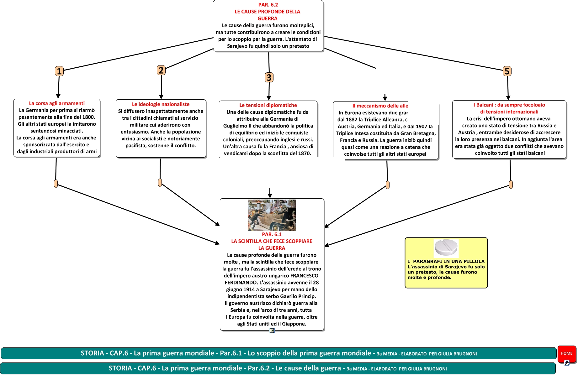 Questa Cmap, creata con IHMC CmapTools, contiene informazioni relative a: STORIA - Par.6.1 - Lo scoppio della prima guerra mondiale - Par.6.2 - Le cause della guerra - GB 3a media, PAR. 6.2 LE CAUSE PROFONDE DELLA GUERRA Le cause della guerra furono molteplici, ma tutte contribuirono a creare le condizioni per lo scoppio per la guerra. L'attentato di Sarajevo fu quindi solo un pretesto 5 I Balcani : da sempre focoloaio di tensioni internazionali La crisi dell'impero ottomano aveva creato uno stato di tensione tra Russia e Austria , entrambe desiderose di accrescere la loro presenza nei balcani. In aggiunta l'area era stata già oggetto due conflitti che avevano coinvolto tutti gli stati balcani, PAR. 6.2 LE CAUSE PROFONDE DELLA GUERRA Le cause della guerra furono molteplici, ma tutte contribuirono a creare le condizioni per lo scoppio per la guerra. L'attentato di Sarajevo fu quindi solo un pretesto 2 Le ideologie nazionaliste Si diffusero inaspettatamente anche tra i cittadini chiamati al servizio militare cui aderirono con entusiasmo. Anche la popolazione vicina ai socialisti e notoriamente pacifista, sostenne il conflitto., La corsa agli armamenti La Germania per prima si riarmò pesantemente alla fine del 1800. Gli altri stati europei la imitarono sentendosi minacciati. La corsa agli armamenti era anche sponsorizzata dall'esercito e dagli industriali produttori di armi PAR. 6.1 LA SCINTILLA CHE FECE SCOPPIARE LA GUERRA Le cause profonde della guerra furono molte , ma la scintilla che fece scoppiare la guerra fu l'assassinio dell'erede al trono dell'impero austro-ungarico FRANCESCO FERDINANDO. L'assassinio avvenne il 28 giugno 1914 a Sarajevo per mano dello indipendentista serbo Gavrilo Princip. Il governo austriaco dichiarò guerra alla Serbia e, nell'arco di tre anni, tutta l'Europa fu coinvolta nella guerra, oltre agli Stati uniti ed il Giappone., PAR. 6.2 LE CAUSE PROFONDE DELLA GUERRA Le cause della guerra furono molteplici, ma tutte contribuirono a creare le condizioni per lo scoppio per la guerra. L'attentato di Sarajevo fu quindi solo un pretesto 4 Il meccanismo delle alleanze In Europa esistevano due grandi blocchi: dal 1882 la Triplice Alleanza, costituita da Austria, Germania ed Italia, e dal 1907 la Triplice Intesa costituita da Gran Bretagna, Francia e Russia. La guerra iniziò quindi quasi come una reazione a catena che coinvolse tutti gli altri stati europei, Le ideologie nazionaliste Si diffusero inaspettatamente anche tra i cittadini chiamati al servizio militare cui aderirono con entusiasmo. Anche la popolazione vicina ai socialisti e notoriamente pacifista, sostenne il conflitto. PAR. 6.1 LA SCINTILLA CHE FECE SCOPPIARE LA GUERRA Le cause profonde della guerra furono molte , ma la scintilla che fece scoppiare la guerra fu l'assassinio dell'erede al trono dell'impero austro-ungarico FRANCESCO FERDINANDO. L'assassinio avvenne il 28 giugno 1914 a Sarajevo per mano dello indipendentista serbo Gavrilo Princip. Il governo austriaco dichiarò guerra alla Serbia e, nell'arco di tre anni, tutta l'Europa fu coinvolta nella guerra, oltre agli Stati uniti ed il Giappone., I Balcani : da sempre focoloaio di tensioni internazionali La crisi dell'impero ottomano aveva creato uno stato di tensione tra Russia e Austria , entrambe desiderose di accrescere la loro presenza nei balcani. In aggiunta l'area era stata già oggetto due conflitti che avevano coinvolto tutti gli stati balcani PAR. 6.1 LA SCINTILLA CHE FECE SCOPPIARE LA GUERRA Le cause profonde della guerra furono molte , ma la scintilla che fece scoppiare la guerra fu l'assassinio dell'erede al trono dell'impero austro-ungarico FRANCESCO FERDINANDO. L'assassinio avvenne il 28 giugno 1914 a Sarajevo per mano dello indipendentista serbo Gavrilo Princip. Il governo austriaco dichiarò guerra alla Serbia e, nell'arco di tre anni, tutta l'Europa fu coinvolta nella guerra, oltre agli Stati uniti ed il Giappone., PAR. 6.2 LE CAUSE PROFONDE DELLA GUERRA Le cause della guerra furono molteplici, ma tutte contribuirono a creare le condizioni per lo scoppio per la guerra. L'attentato di Sarajevo fu quindi solo un pretesto 3 Le tensioni diplomatiche Una delle cause diplomatiche fu da attribuire alla Germania di Guglielmo II che abbandonò la politica di equilibrio ed iniziò le conquiste coloniali, preoccupando inglesi e russi. Un'altra causa fu la Francia , ansiosa di vendicarsi dopo la sconfitta del 1870., Il meccanismo delle alleanze In Europa esistevano due grandi blocchi: dal 1882 la Triplice Alleanza, costituita da Austria, Germania ed Italia, e dal 1907 la Triplice Intesa costituita da Gran Bretagna, Francia e Russia. La guerra iniziò quindi quasi come una reazione a catena che coinvolse tutti gli altri stati europei PAR. 6.1 LA SCINTILLA CHE FECE SCOPPIARE LA GUERRA Le cause profonde della guerra furono molte , ma la scintilla che fece scoppiare la guerra fu l'assassinio dell'erede al trono dell'impero austro-ungarico FRANCESCO FERDINANDO. L'assassinio avvenne il 28 giugno 1914 a Sarajevo per mano dello indipendentista serbo Gavrilo Princip. Il governo austriaco dichiarò guerra alla Serbia e, nell'arco di tre anni, tutta l'Europa fu coinvolta nella guerra, oltre agli Stati uniti ed il Giappone., PAR. 6.2 LE CAUSE PROFONDE DELLA GUERRA Le cause della guerra furono molteplici, ma tutte contribuirono a creare le condizioni per lo scoppio per la guerra. L'attentato di Sarajevo fu quindi solo un pretesto 1 La corsa agli armamenti La Germania per prima si riarmò pesantemente alla fine del 1800. Gli altri stati europei la imitarono sentendosi minacciati. La corsa agli armamenti era anche sponsorizzata dall'esercito e dagli industriali produttori di armi, Le tensioni diplomatiche Una delle cause diplomatiche fu da attribuire alla Germania di Guglielmo II che abbandonò la politica di equilibrio ed iniziò le conquiste coloniali, preoccupando inglesi e russi. Un'altra causa fu la Francia , ansiosa di vendicarsi dopo la sconfitta del 18
