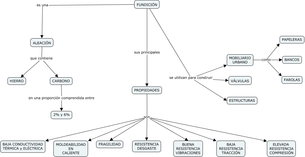 Este Cmap, tiene información relacionada con: FUNDICIÓN, PROPIEDADES son RESISTENCIA DESGASTE, FUNDICIÓN se utilizan para construir ESTRUCTURAS, PROPIEDADES son BAJA RESISTENCIA TRACCIÓN, PROPIEDADES son FRAGILIDAD, MOBILIARIO URBANO como FAROLAS, ALEACIÓN que contiene CARBONO, ALEACIÓN que contiene HIERRO, FUNDICIÓN sus principales PROPIEDADES, FUNDICIÓN se utilizan para construir VÁLVULAS, CARBONO en una proporción comprendida entre 2% y 6%, FUNDICIÓN es una ALEACIÓN, MOBILIARIO URBANO como BANCOS, MOBILIARIO URBANO como PAPELERAS, PROPIEDADES son MOLDEABILIDAD EN CALIENTE, PROPIEDADES son BUENA RESISTENCIA VIBRACIONES, PROPIEDADES son BAJA CONDUCTIVIDAD TÉRMICA y ELÉCTRICA, FUNDICIÓN se utilizan para construir MOBILIARIO URBANO, PROPIEDADES son ELEVADA RESISTENCIA COMPRESIÓN