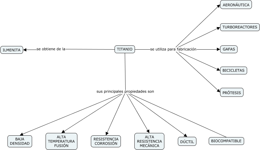 Este Cmap, tiene información relacionada con: TITANIO, TITANIO sus principales propiedades son ALTA RESISTENCIA MECÁNICA, TITANIO se obtiene de la ILMENITA, TITANIO se utiliza para fabricación TURBOREACTORES, TITANIO sus principales propiedades son DÚCTIL, TITANIO sus principales propiedades son BAJA DENSIDAD, TITANIO sus principales propiedades son BIOCOMPATIBLE, TITANIO se utiliza para fabricación PRÓTESIS, TITANIO se utiliza para fabricación BICICLETAS, TITANIO se utiliza para fabricación AERONÁUTICA, TITANIO sus principales propiedades son RESISTENCIA CORROSIÓN, TITANIO se utiliza para fabricación GAFAS, TITANIO sus principales propiedades son ALTA TEMPERATURA FUSIÓN