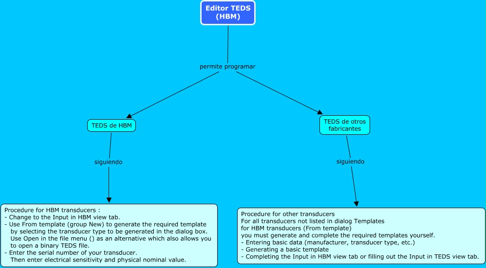 Este Cmap, tiene información relacionada con: Editor TEDS (HBM), Editor TEDS (HBM) permite programar TEDS de otros fabricantes, Editor TEDS (HBM) permite programar TEDS de HBM, TEDS de HBM siguiendo Procedure for HBM transducers : - Change to the Input in HBM view tab. - Use From template (group New) to generate the required template by selecting the transducer type to be generated in the dialog box. Use Open in the file menu () as an alternative which also allows you to open a binary TEDS file. - Enter the serial number of your transducer. Then enter electrical sensitivity and physical nominal value., TEDS de otros fabricantes siguiendo Procedure for other transducers For all transducers not listed in dialog Templates for HBM transducers (From template) you must generate and complete the required templates yourself. - Entering basic data (manufacturer, transducer type, etc.) - Generating a basic template - Completing the Input in HBM view tab or filling out the Input in TEDS view tab.