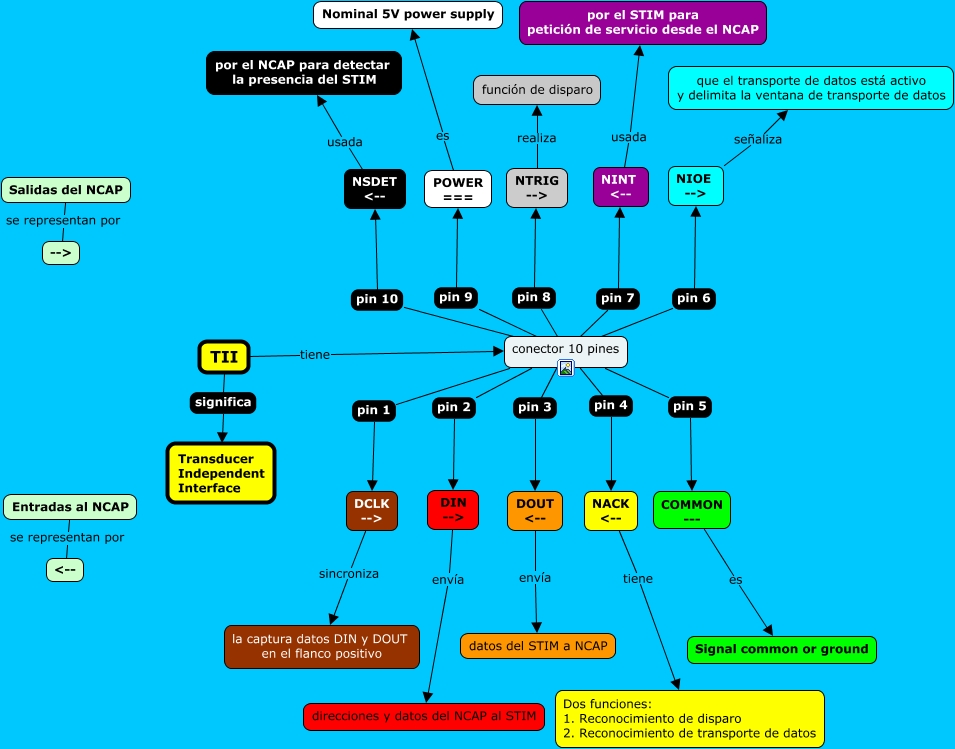 Este Cmap, tiene información relacionada con: TII, conector 10 pines pin 7 NINT <--, Entradas al NCAP se representan por <--, conector 10 pines pin 3 DOUT <--, conector 10 pines pin 5 COMMON ---, POWER === es Nominal 5V power supply, NACK <-- tiene Dos funciones: 1. Reconocimiento de disparo 2. Reconocimiento de transporte de datos, NINT <-- usada por el STIM para petición de servicio desde el NCAP, conector 10 pines pin 1 DCLK -->, DCLK --> sincroniza la captura datos DIN y DOUT en el flanco positivo, Salidas del NCAP se representan por -->, conector 10 pines pin 2 DIN -->, conector 10 pines pin 4 NACK <--, conector 10 pines pin 9 POWER ===, NIOE --> señaliza que el transporte de datos está activo y delimita la ventana de transporte de datos, DOUT <-- envía datos del STIM a NCAP, NSDET <-- usada por el NCAP para detectar la presencia del STIM, NTRIG --> realiza función de disparo, COMMON --- es Signal common or ground, conector 10 pines pin 8 NTRIG -->, DIN --> envía direcciones y datos del NCAP al STIM