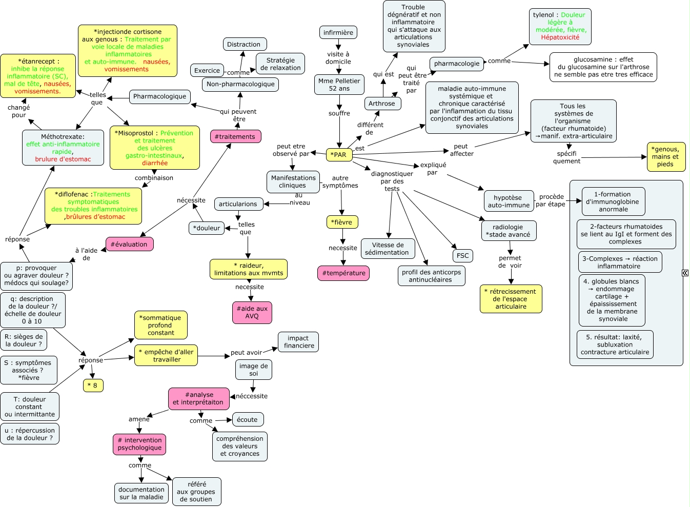 Cette carte de concepts créée avec IHMC CmapTools traite de: SIC 4 REGIGURL, #traitements qui peuvent être Non-pharmacologique, *Misoprostol : Prévention et traitement des ulcères gastro-intestinaux, diarrhée combinaison *diflofenac :Traitements symptomatiques des troubles inflammatoires ,brûlures d’estomac, articularions telles que * raideur, limitations aux mvmts, *PAR expliqué par hypotèse auto-immune, Non-pharmacologique comme Stratégie de relaxation, # intervention psychologique comme documentation sur la maladie, q: description de la douleur ?/ échelle de douleur 0 à 10 réponse * empêche d'aller travailler, *PAR diagnostiquer par des tests Vitesse de sédimentation, pharmacologie comme glucosamine : effet du glucosamine sur l'arthrose ne semble pas etre tres efficace, Non-pharmacologique comme Distraction, # intervention psychologique comme référé aux groupes de soutien, Arthrose qui est Trouble dégnératif et non inflammatoire qui s'attaque aux articulations synoviales, pharmacologie comme tylenol : Douleur légère à modérée, fièvre, Hépatoxicité, q: description de la douleur ?/ échelle de douleur 0 à 10 réponse *sommatique profond constant, hypotèse auto-immune procède par étape 1-formation d'immunoglobine anormale, Pharmacologique telles que Méthotrexate: effet anti-inflammatoire rapide, brulure d'estomac, infirmière visite à domicile Mme Pelletier 52 ans, #analyse et interprétaiton amene # intervention psychologique, p: provoquer ou agraver douleur ? médocs qui soulage? réponse Méthotrexate: effet anti-inflammatoire rapide, brulure d'estomac, *fièvre necessite #température