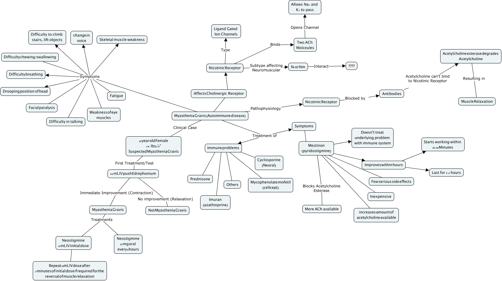 This Concept Map, created with IHMC CmapTools, has information related to: MG Bitches, Nicotinic Receptor Subtype affecting Neuromuscular N1 or Nm, Immune problems ???? Mycophenolate mofetil (cellcept), Myasthenia Gravis (Autoimmune disease) Symptoms Fatigue, Myasthenia Gravis (Autoimmune disease) Symptoms Weakness of eye muscles, Difficulty chewing/swallowing Symptoms Difficulty breathing, Mestinon (pyridostigmine) ???? Doesn't treat underlying problem with immune system, Two ACh Molceules Opens Channel Allows Na+ and K+ to pass, Myasthenia Gravis (Autoimmune disease) Treatment of Immune problems, Improves within hours ???? Last for 3-6 hours, N1 or Nm Interact ????, Myasthenia Gravis (Autoimmune disease) Symptoms Drooping position of head, Mestinon (pyridostigmine) ???? Few serious side effects, Immune problems ???? Cyclosporine (Neoral), Difficulty chewing/swallowing Symptoms change in voice, Difficulty chewing/swallowing Symptoms Skeletal muscle weakness, Difficulty chewing/swallowing Symptoms Facial paralysis, Myasthenia Gravis (Autoimmune disease) Symptoms Difficulty to climb stairs, lift objects, Myasthenia Gravis (Autoimmune disease) Treatment of Symptoms, Nicotinic Receptor Binds Two ACh Molceules, Immune problems ???? Prednisone