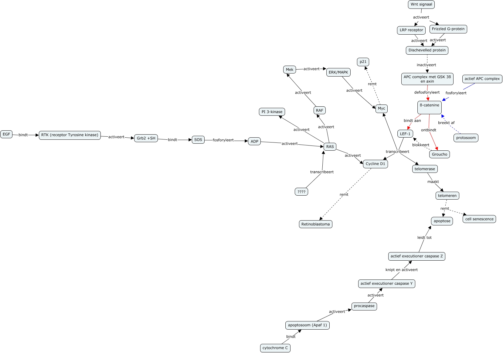 Deze Concept Map heeft informatie gerelateerd aan: Wnt pathway, Mek activeert ERK/MAPK, Myc remt p21, Frizzled G-protein activeert Dischevelled protein, apoptosoom (Apaf 1) activeert procaspase, Wnt signaal activeert Frizzled G-protein, LEF-1 transcribeert Myc, ß-catenine ontbindt Groucho, LEF-1 transcribeert Cycline D1, ERK/MAPK activeert Myc, procaspase activeert actief executioner caspase Y, EGF bindt RTK (receptor Tyrosine kinase), cytochrome C bindt apoptosoom (Apaf 1), Groucho blokkeert LEF-1, actief executioner caspase Y knipt en activeert actief executioner caspase Z, protosoom breekt af ß-catenine, RAS activeert Cycline D1, Wnt signaal activeert LRP receptor, telomeren remt cell senescence, RAS activeert PI 3-kinase, RTK (receptor Tyrosine kinase) activeert Grb2 +SH