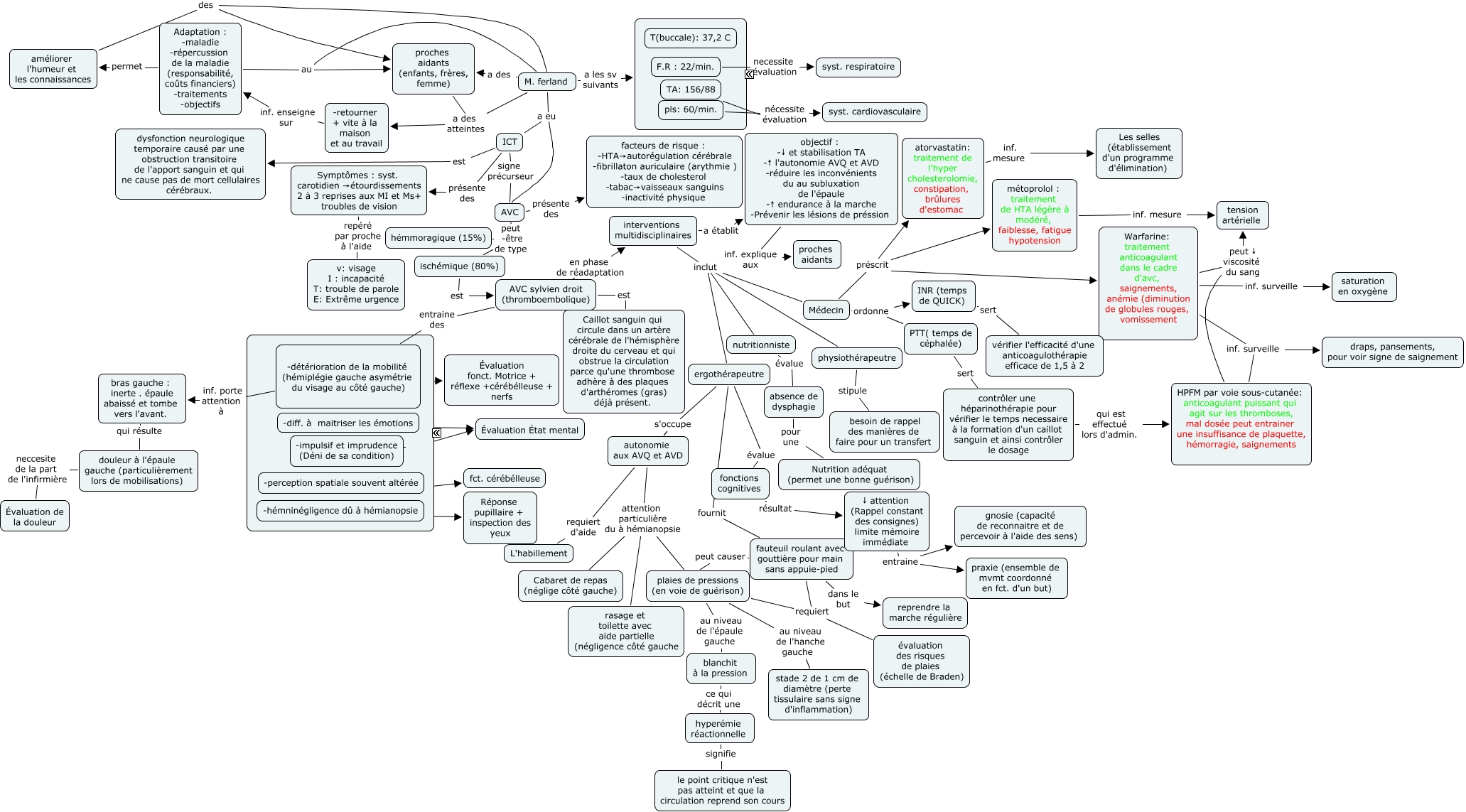 Cette carte de concepts créée avec IHMC CmapTools traite de: SIC5REGIGURL.cmap, interventions multidisciplinaires a établit objectif : -↓ et stabilisation TA -↑ l'autonomie AVQ et AVD -réduire les inconvénients du au subluxation de l'épaule -↑ endurance à la marche -Prévenir les lésions de préssion, AVC peut -être de type hémmoragique (15%), métoprolol : traitement de HTA légère à modéré, faiblesse, fatigue hypotension inf. mesure tension artérielle, autonomie aux AVQ et AVD attention particulière du à hémianopsie plaies de pressions (en voie de guérison), interventions multidisciplinaires inclut nutritionniste, M. ferland a des atteintes -retourner + vite à la maison et au travail, atorvastatin: traitement de l'hyper cholesterolomie, constipation, brûlures d'estomac inf. mesure Les selles (établissement d'un programme d'élimination), améliorer l'humeur et les connaissances des proches aidants (enfants, frères, femme), Adaptation : -maladie -répercussion de la maladie (responsabilité, coûts financiers) -traitements -objectifs au proches aidants (enfants, frères, femme), autonomie aux AVQ et AVD attention particulière du à hémianopsie Cabaret de repas (néglige côté gauche), M. ferland a eu AVC, interventions multidisciplinaires inclut ergothérapeutre, interventions multidisciplinaires inclut physiothérapeutre, Symptômes : syst. carotidien →étourdissements 2 à 3 reprises aux MI et Ms+ troubles de vision repéré par proche à l'aide v: visage I : incapacité T: trouble de parole E: Extrême urgence, ICT est dysfonction neurologique temporaire causé par une obstruction transitoire de l'apport sanguin et qui ne cause pas de mort cellulaires cérébraux., Adaptation : -maladie -répercussion de la maladie (responsabilité, coûts financiers) -traitements -objectifs permet améliorer l'humeur et les connaissances, AVC sylvien droit (thromboembolique) est Caillot sanguin qui circule dans un artère cérébrale de l'hémisphère droite du cerveau et qui obstrue la circulation parce qu'une thrombose adhère à des plaques d'arthéromes (gras) déjà présent., AVC sylvien droit (thromboembolique) en phase de réadaptation interventions multidisciplinaires, M. ferland a les sv suivants ????, ergothérapeutre évalue fonctions cognitives