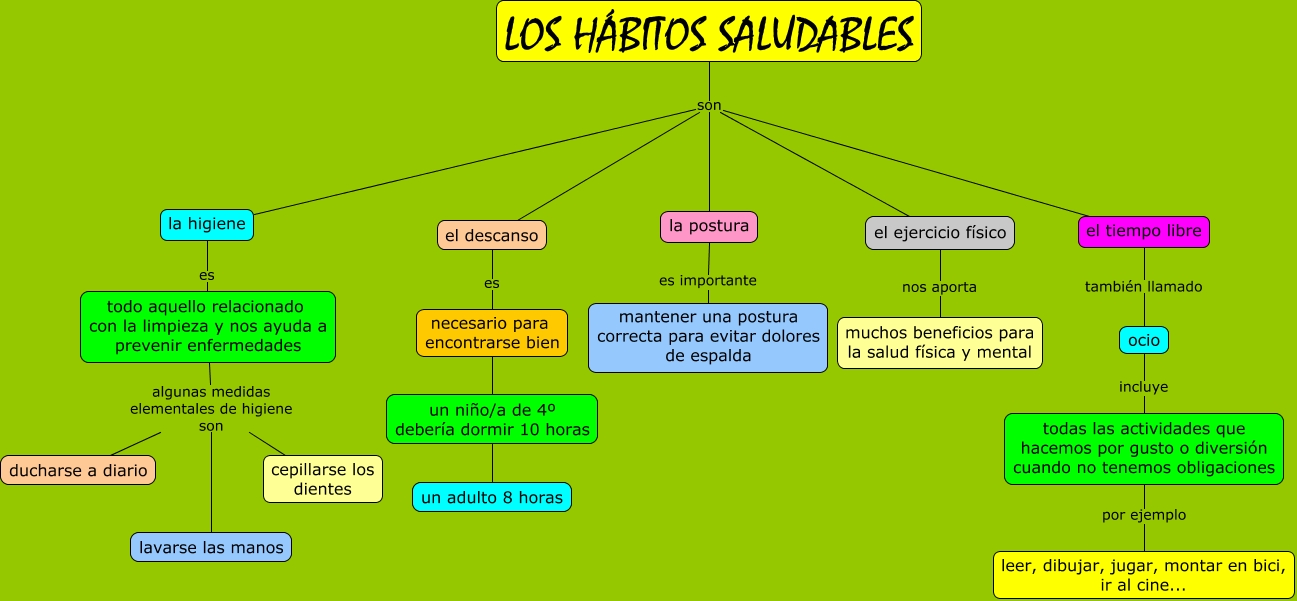 Este Cmap, tiene información relacionada con: Los hábitos saludables, la higiene es todo aquello relacionado con la limpieza y nos ayuda a prevenir enfermedades, todo aquello relacionado con la limpieza y nos ayuda a prevenir enfermedades algunas medidas elementales de higiene son lavarse las manos, todo aquello relacionado con la limpieza y nos ayuda a prevenir enfermedades algunas medidas elementales de higiene son cepillarse los dientes, LOS HÁBITOS SALUDABLES son el ejercicio físico, el ejercicio físico nos aporta muchos beneficios para la salud física y mental, necesario para encontrarse bien un niño/a de 4º debería dormir 10 horas, ocio incluye todas las actividades que hacemos por gusto o diversión cuando no tenemos obligaciones, un niño/a de 4º debería dormir 10 horas un adulto 8 horas, el descanso es necesario para encontrarse bien, el tiempo libre también llamado ocio, todo aquello relacionado con la limpieza y nos ayuda a prevenir enfermedades algunas medidas elementales de higiene son ducharse a diario, LOS HÁBITOS SALUDABLES son la higiene, LOS HÁBITOS SALUDABLES son el tiempo libre, todas las actividades que hacemos por gusto o diversión cuando no tenemos obligaciones por ejemplo leer, dibujar, jugar, montar en bici, ir al cine..., la postura es importante mantener una postura correcta para evitar dolores de espalda, LOS HÁBITOS SALUDABLES son el descanso, LOS HÁBITOS SALUDABLES son la postura