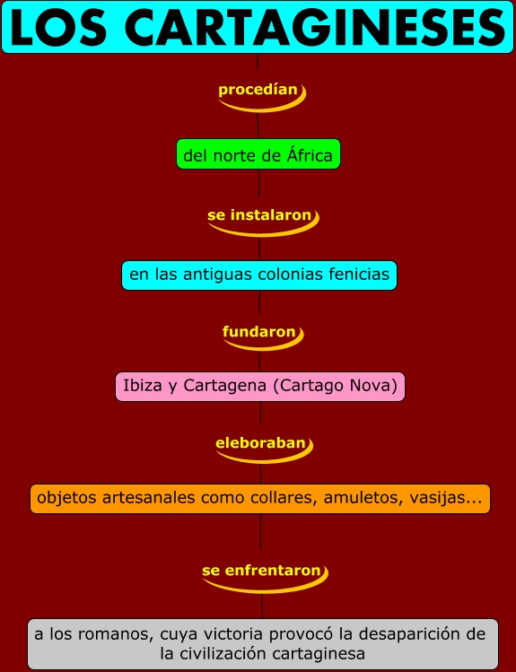 Este Cmap, tiene información relacionada con: Los cartagineses, en las antiguas colonias fenicias fundaron Ibiza y Cartagena (Cartago Nova), LOS CARTAGINESES procedían del norte de África, del norte de África se instalaron en las antiguas colonias fenicias, objetos artesanales como collares, amuletos, vasijas... se enfrentaron a los romanos, cuya victoria provocó la desaparición de la civilización cartaginesa, Ibiza y Cartagena (Cartago Nova) eleboraban objetos artesanales como collares, amuletos, vasijas...