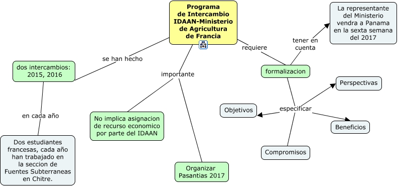 Este Cmap, tiene información relacionada con: ProgramaIntercambioFrancia, formalizacion especificar Perspectivas, formalizacion especificar Compromisos, Programa de Intercambio IDAAN-Ministerio de Agricultura de Francia importante Organizar Pasantias 2017, Programa de Intercambio IDAAN-Ministerio de Agricultura de Francia requiere formalizacion, formalizacion tener en cuenta La representante del Ministerio vendra a Panama en la sexta semana del 2017, Programa de Intercambio IDAAN-Ministerio de Agricultura de Francia se han hecho dos intercambios: 2015, 2016, formalizacion especificar Objetivos, dos intercambios: 2015, 2016 en cada año Dos estudiantes francesas, cada año han trabajado en la seccion de Fuentes Subterraneas en Chitre., formalizacion especificar Beneficios, Programa de Intercambio IDAAN-Ministerio de Agricultura de Francia importante No implica asignacion de recurso economico por parte del IDAAN