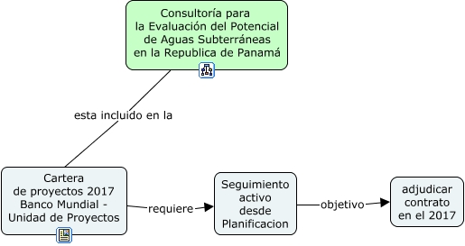Este Cmap, tiene información relacionada con: Proyecto_potencial_aguas_subterraneas, Consultoría para la Evaluación del Potencial de Aguas Subterráneas en la Republica de Panamá esta incluido en la Cartera de proyectos 2017 Banco Mundial - Unidad de Proyectos, Cartera de proyectos 2017 Banco Mundial - Unidad de Proyectos requiere Seguimiento activo desde Planificacion, Seguimiento activo desde Planificacion objetivo adjudicar contrato en el 2017