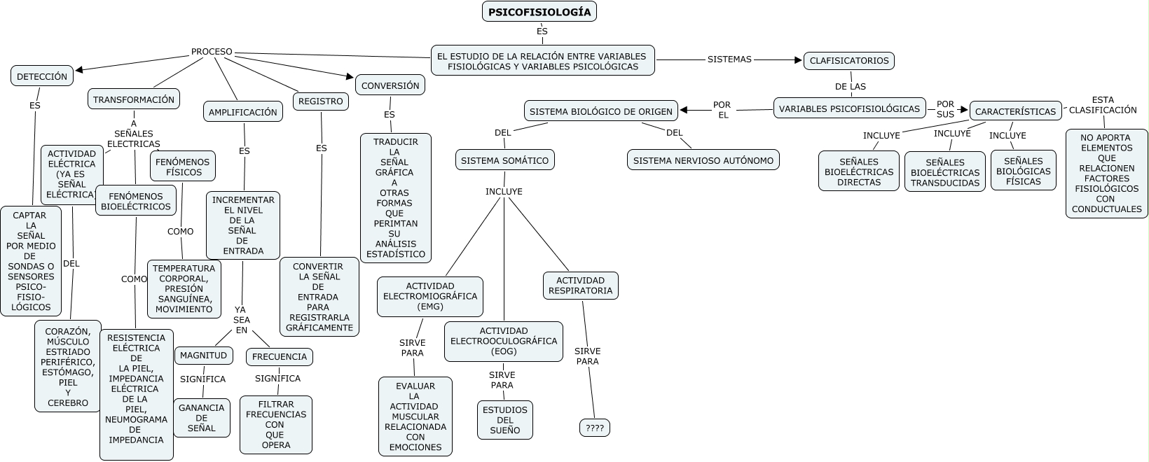 Este Cmap, tiene información relacionada con: TécnicasPSICOFISIOLÓGICAS_lópezcampos, ACTIVIDAD RESPIRATORIA SIRVE PARA ????, EL ESTUDIO DE LA RELACIÓN ENTRE VARIABLES FISIOLÓGICAS Y VARIABLES PSICOLÓGICAS PROCESO AMPLIFICACIÓN, FRECUENCIA SIGNIFICA FILTRAR FRECUENCIAS CON QUE OPERA, EL ESTUDIO DE LA RELACIÓN ENTRE VARIABLES FISIOLÓGICAS Y VARIABLES PSICOLÓGICAS PROCESO DETECCIÓN, INCREMENTAR EL NIVEL DE LA SEÑAL DE ENTRADA YA SEA EN FRECUENCIA, TRANSFORMACIÓN A SEÑALES ELECTRICAS ACTIVIDAD ELÉCTRICA (YA ES SEÑAL ELÉCTRICA), CARACTERÍSTICAS ESTA CLASIFICACIÓN NO APORTA ELEMENTOS QUE RELACIONEN FACTORES FISIOLÓGICOS CON CONDUCTUALES, VARIABLES PSICOFISIOLÓGICAS POR EL SISTEMA BIOLÓGICO DE ORIGEN, AMPLIFICACIÓN ES INCREMENTAR EL NIVEL DE LA SEÑAL DE ENTRADA, EL ESTUDIO DE LA RELACIÓN ENTRE VARIABLES FISIOLÓGICAS Y VARIABLES PSICOLÓGICAS PROCESO CONVERSIÓN, CARACTERÍSTICAS INCLUYE SEÑALES BIOELÉCTRICAS TRANSDUCIDAS, EL ESTUDIO DE LA RELACIÓN ENTRE VARIABLES FISIOLÓGICAS Y VARIABLES PSICOLÓGICAS PROCESO TRANSFORMACIÓN, TRANSFORMACIÓN A SEÑALES ELECTRICAS FENÓMENOS BIOELÉCTRICOS, PSICOFISIOLOGÍA ES EL ESTUDIO DE LA RELACIÓN ENTRE VARIABLES FISIOLÓGICAS Y VARIABLES PSICOLÓGICAS, ACTIVIDAD ELÉCTRICA (YA ES SEÑAL ELÉCTRICA) DEL CORAZÓN, MÚSCULO ESTRIADO PERIFÉRICO, ESTÓMAGO, PIEL Y CEREBRO, EL ESTUDIO DE LA RELACIÓN ENTRE VARIABLES FISIOLÓGICAS Y VARIABLES PSICOLÓGICAS PROCESO REGISTRO, SISTEMA BIOLÓGICO DE ORIGEN DEL SISTEMA SOMÁTICO, CARACTERÍSTICAS INCLUYE SEÑALES BIOLÓGICAS FÍSICAS, ACTIVIDAD ELECTROMIOGRÁFICA (EMG) SIRVE PARA EVALUAR LA ACTIVIDAD MUSCULAR RELACIONADA CON EMOCIONES, CLAFISICATORIOS DE LAS VARIABLES PSICOFISIOLÓGICAS