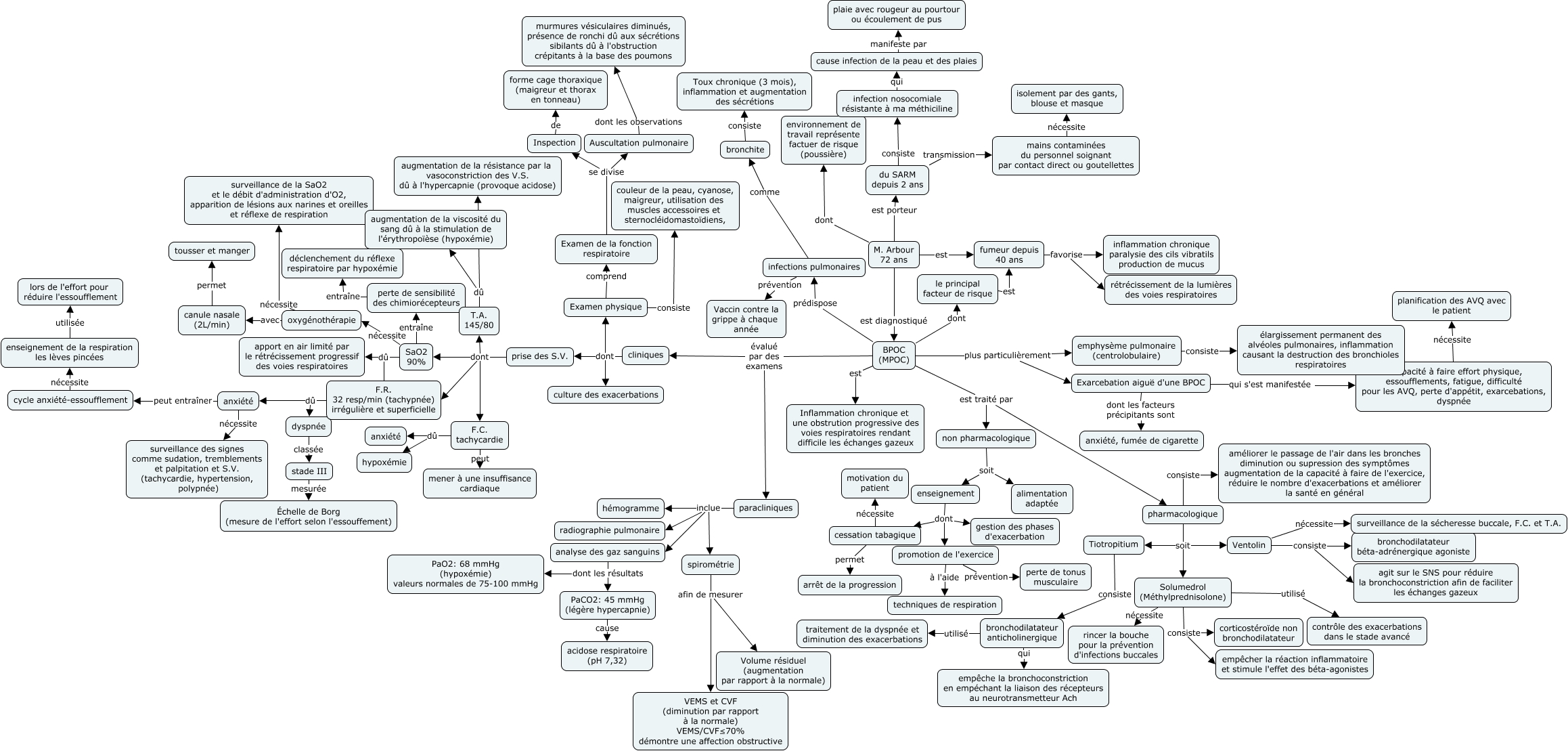 Cette carte de concepts créée avec IHMC CmapTools traite de: MPOC, du SARM depuis 2 ans transmission mains contaminées du personnel soignant par contact direct ou goutellettes, BPOC (MPOC) dont le principal facteur de risque, bronchite consiste Toux chronique (3 mois), inflammation et augmentation des sécrétions, incapacité à faire effort physique, essoufflements, fatigue, difficulté pour les AVQ, perte d'appétit, exarcebations, dyspnée nécessite planification des AVQ avec le patient, BPOC (MPOC) prédispose infections pulmonaires, Ventolin consiste bronchodilatateur béta-adrénergique agoniste, stade III mesurée Échelle de Borg (mesure de l'effort selon l'essouffement), anxiété peut entraîner cycle anxiété-essoufflement, Tiotropitium consiste bronchodilatateur anticholinergique, du SARM depuis 2 ans consiste infection nosocomiale résistante à ma méthiciline, SaO2 90% entraîne perte de sensibilité des chimiorécepteurs, spirométrie afin de mesurer VEMS et CVF (diminution par rapport à la normale) VEMS/CVF≤70% démontre une affection obstructive, F.R. 32 resp/min (tachypnée) irrégulière et superficielle dû dyspnée, prise des S.V. dont F.C. tachycardie, infections pulmonaires comme bronchite, BPOC (MPOC) est traité par non pharmacologique, prise des S.V. dont F.R. 32 resp/min (tachypnée) irrégulière et superficielle, SaO2 90% dû apport en air limité par le rétrécissement progressif des voies respiratoires, F.C. tachycardie peut mener à une insuffisance cardiaque, BPOC (MPOC) est Inflammation chronique et une obstrution progressive des voies respiratoires rendant difficile les échanges gazeux