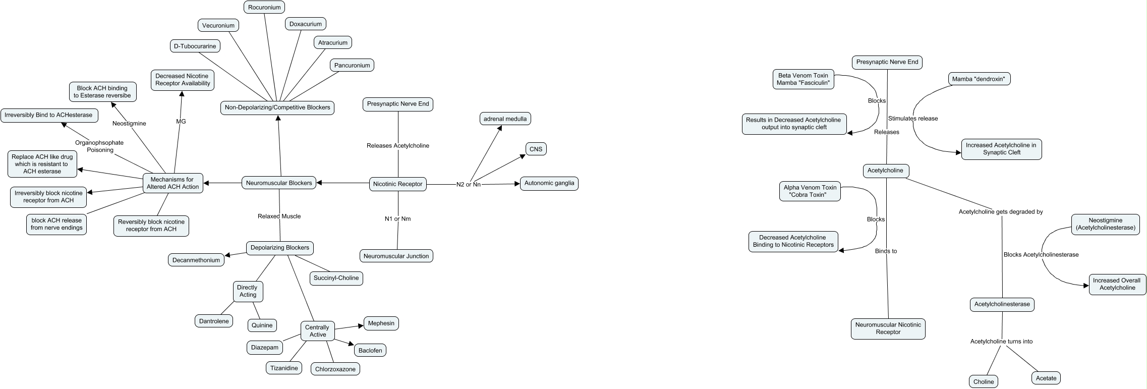 This Concept Map, created with IHMC CmapTools, has information related to: ACETYLCHOLINE OD, Nicotinic Receptor N2 or Nn Autonomic ganglia, Acetylcholine Acetylcholine gets degraded by Acetylcholinesterase, Acetylcholinesterase Acetylcholine turns into Acetate, Acetylcholinesterase Acetylcholine turns into Choline, Mechanisms for Altered ACH Action ???? Replace ACH like drug which is resistant to ACH esterase, Neuromuscular Blockers Non-Depolarizing/Competitive Blockers, Neostigmine (Acetylcholinesterase) Blocks Acetylcholinesterase Increased Overall Acetylcholine, Acetylcholine Binds to Neuromuscular Nicotinic Receptor, Neuromuscular Blockers ???? Mechanisms for Altered ACH Action, Centrally Active ???? Chlorzoxazone, Presynaptic Nerve End Releases Acetylcholine Nicotinic Receptor, Centrally Active ???? Diazepam, Mechanisms for Altered ACH Action ???? block ACH release from nerve endings, Nicotinic Receptor N2 or Nn CNS, Mechanisms for Altered ACH Action ???? Reversibly block nicotine receptor from ACH, Centrally Active ???? Baclofen, Depolarizing Blockers ???? Directly Acting, Presynaptic Nerve End Releases Acetylcholine, Nicotinic Receptor N1 or Nm Neuromuscular Junction, Non-Depolarizing/Competitive Blockers ???? Vecuronium