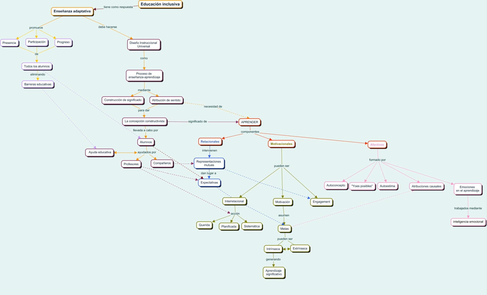 Este Cmap, tiene información relacionada con: Ed. Inclusiva, Profesores acción Planificada, Afectivos formado por Autoconcepto, Expectativas ???? Metas, APRENDER componentes Motivacionales, Progreso de Todos los alumnos, Diseño Instruccional Universal como Proceso de enseñanza-aprendizaje, APRENDER componentes Relacionales, Alumnos ayudados por Profesores, Motivacionales pueden ser Engagement, Compañeros Representaciones mutuas, Representaciones mutuas Engagement, Enseñanza adaptativa promueve Progreso, Interrelacional acción Planificada, Construcción de significado para dar La concepción constructivista, La concepción constructivista significado de APRENDER, Profesores acción Querida, Afectivos formado por Autoestima, Metas pueden ser Extrínseca, Presencia de Todos los alumnos, Afectivos formado por "Yoes posibles"