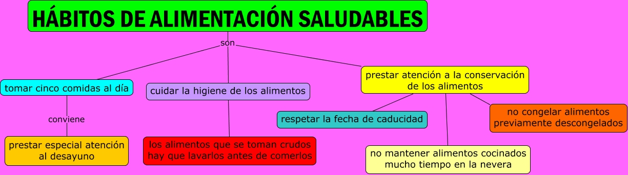 Este Cmap, tiene información relacionada con: Hábitos de alimentación saludables, HÁBITOS DE ALIMENTACIÓN SALUDABLES son cuidar la higiene de los alimentos, cuidar la higiene de los alimentos los alimentos que se toman crudos hay que lavarlos antes de comerlos, tomar cinco comidas al día conviene prestar especial atención al desayuno, prestar atención a la conservación de los alimentos no congelar alimentos previamente descongelados, prestar atención a la conservación de los alimentos no mantener alimentos cocinados mucho tiempo en la nevera, HÁBITOS DE ALIMENTACIÓN SALUDABLES son prestar atención a la conservación de los alimentos, prestar atención a la conservación de los alimentos respetar la fecha de caducidad, HÁBITOS DE ALIMENTACIÓN SALUDABLES son tomar cinco comidas al día