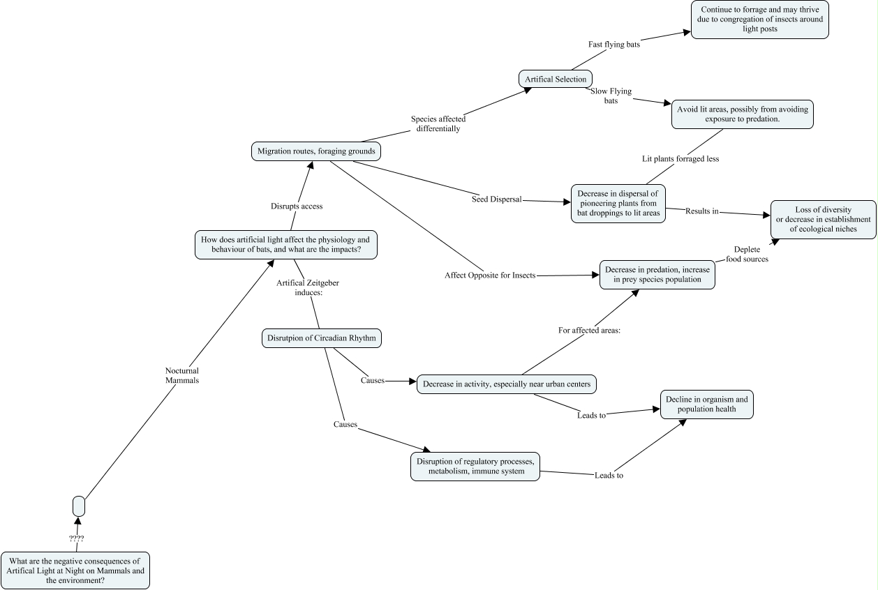 This Concept Map, created with IHMC CmapTools, has information related to: Bats and ALAN, Migration routes, foraging grounds Species affected differentially Artifical Selection, Avoid lit areas, possibly from avoiding exposure to predation. Lit plants forraged less Decrease in dispersal of pioneering plants from bat droppings to lit areas, Disruption of regulatory processes, metabolism, immune system Leads to Decline in organism and population health, Decrease in dispersal of pioneering plants from bat droppings to lit areas Results in Loss of diversity or decrease in establishment of ecological niches, Nocturnal Mammals How does artificial light affect the physiology and behaviour of bats, and what are the impacts?, Disrutpion of Circadian Rhythm Causes Disruption of regulatory processes, metabolism, immune system, How does artificial light affect the physiology and behaviour of bats, and what are the impacts? Disrupts access Migration routes, foraging grounds, Decrease in activity, especially near urban centers Leads to Decline in organism and population health, Migration routes, foraging grounds Seed Dispersal Decrease in dispersal of pioneering plants from bat droppings to lit areas, Artifical Selection Fast flying bats Continue to forrage and may thrive due to congregation of insects around light posts, Decrease in activity, especially near urban centers For affected areas: Decrease in predation, increase in prey species population, How does artificial light affect the physiology and behaviour of bats, and what are the impacts? Artifical Zeitgeber induces: Disrutpion of Circadian Rhythm, What are the negative consequences of Artifical Light at Night on Mammals and the environment? ????, Decrease in predation, increase in prey species population Deplete food sources Loss of diversity or decrease in establishment of ecological niches, Disrutpion of Circadian Rhythm Causes Decrease in activity, especially near urban centers, Migration routes, foraging grounds Affect Opposite for Insects Decrease in predation, increase in prey species population, Artifical Selection Slow Flying bats Avoid lit areas, possibly from avoiding exposure to predation.