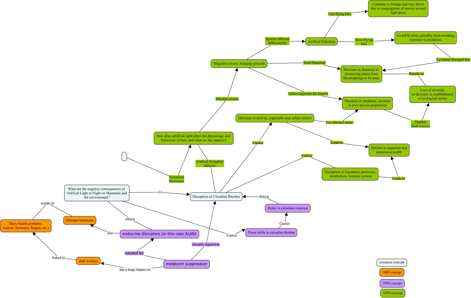 This Concept Map, created with IHMC CmapTools, has information related to: Marie's addition, How does artificial light affect the physiology and behaviour of bats, and what are the impacts? Disrupts access Migration routes, foraging grounds, Disruption of Circadian Rhythm Causes Decrease in activity, especially near urban centers, Avoid lit areas, possibly from avoiding exposure to predation. Lit plants forraged less Decrease in dispersal of pioneering plants from bat droppings to lit areas, Disruption of Circadian Rhythm Causes Disruption of regulatory processes, metabolism, immune system, Decrease in activity, especially near urban centers Leads to Decline in organism and population health, Decrease in predation, increase in prey species population Deplete food sources Loss of diversity or decrease in establishment of ecological niches, melatonin suppression has a huge impact on shift workers, Artifical Selection Slow Flying bats Avoid lit areas, possibly from avoiding exposure to predation., What are the negative consequences of Artifical Light at Night on Mammals and the environment? (-) Disruption of Circadian Rhythm, Disruption of regulatory processes, metabolism, immune system Leads to Decline in organism and population health, Migration routes, foraging grounds Species affected differentially Artifical Selection, Delay in circadian response Which Disruption of Circadian Rhythm, Migration routes, foraging grounds Affect Opposite for Insects Decrease in predation, increase in prey species population, How does artificial light affect the physiology and behaviour of bats, and what are the impacts? Artifical Zeitgeber induces: Disruption of Circadian Rhythm, Disrupts hormones results in Many health problems (cancer, insomnia, fatigue, etc.), Migration routes, foraging grounds Seed Dispersal Decrease in dispersal of pioneering plants from bat droppings to lit areas, melatonin suppression caused by endocrine disruptors (in this case ALAN), What are the negative consequences of Artifical Light at Night on Mammals and the environment? Causes Phase shifts in circadian rhythm, Decrease in activity, especially near urban centers For affected areas: Decrease in predation, increase in prey species population, Artifical Selection Fast flying bats Continue to forrage and may thrive due to congregation of insects around light posts