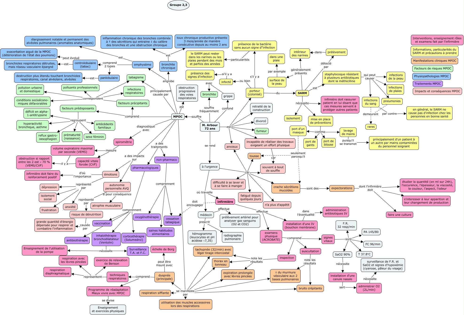 Cette carte de concepts créée avec IHMC CmapTools traite de: SIC 6 MPOC, Programme de réadaptation Mieux vivre avec MPOC se divise Enseignement et exercices physiques, MPOC se manifeste par dyspnée (principale), signes vitaux sont F.R. 32 resp/min, infirmière doit encougager cessation tabagique, spirométrie mesure capacité vitale forcée (CVF), MPOC a des impacts sur autonomie personnelle AVQ, techniques respiratoires représentent exercice de relaxation de Benson, non-pharmaco comprennent oxygénothérapie, émotions d'où l'importance infirmière doit faire du renforcement positif, SaO2 90% nécessite installation d'une canule nasale, facteurs prédisposants regroupent antécédents familiaux, grippe avec bronchite, expectorations dont l'infirmière doit étudier la quantité (en ml sur 24h), l'occurence, l'épaisseur, la viscosité, la couleur, l'aspect, l'odeur, à l'urgence car crache sécrétions mucoïdes, facteurs prédisposants regroupent déficit en alpha- 1-antitrypsine, prélèvement dans intérieur des narines, inspection note les résultats tachypnée (32/min) avec léger tirage intercostal, à l'urgence où travaille médecin, surface de la peau par exemple dans une plaie, port d'un masque seulement parcequ'il crache sécrétions mucoïdes