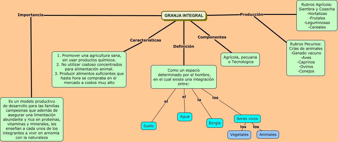 Este Cmap, tiene información relacionada con: Granja Integral, Seres vivos los Animales, GRANJA INTEGRAL Características 1. Promover una agricultura sana, sin usar productos químicos. 2. No utilizar costoso concentrados para alimentación animal. 3. Producir alimentos suficientes que hasta hora se compraba en el mercado a costos muy alto, GRANJA INTEGRAL Componentes Agrícola, pecuaria o Tecnologica, Como un espacio determinado por el hombre, en el cual existe una integración entre: el Agua, GRANJA INTEGRAL Definición Como un espacio determinado por el hombre, en el cual existe una integración entre:, GRANJA INTEGRAL Importancia Es un modelo productivo de desarrollo para las familias campesinas que además de asegurar una limentación abundante y rica en proteínas, vitaminas y minerales, les enseñan a cada unos de los integrantes a vivir en arnomía con la naturaleza, Seres vivos los Vegetales, Como un espacio determinado por el hombre, en el cual existe una integración entre: la Eergía, Como un espacio determinado por el hombre, en el cual existe una integración entre: los Seres vivos, GRANJA INTEGRAL Producción Rubros Pecurios: Crías de animales -Ganado vacuno -Aves -Caprinos -Ovinos -Conejos, Como un espacio determinado por el hombre, en el cual existe una integración entre: el Suelo, GRANJA INTEGRAL Producción ????