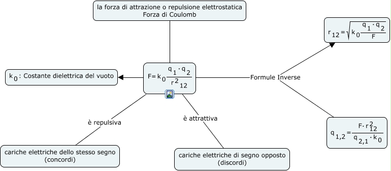 Questa Cmap, creata con IHMC CmapTools, contiene informazioni relative a: interazione elettrostatica, <math xmlns="http://www.w3.org/1998/Math/MathML"> <mrow> <mtext> F= </mtext> <mmultiscripts> <mtext> k </mtext> <mtext> 0 </mtext> <none/> </mmultiscripts> <mfrac> <mrow> <mmultiscripts> <mtext> q </mtext> <mtext> 1 </mtext> <none/> </mmultiscripts> <mtext> ⋅ </mtext> <mmultiscripts> <mtext> q </mtext> <mtext> 2 </mtext> <none/> </mmultiscripts> </mrow> <mmultiscripts> <mmultiscripts> <mtext> r </mtext> <none/> <mtext> 2 </mtext> </mmultiscripts> <mtext> 12 </mtext> <none/> </mmultiscripts> </mfrac> </mrow> </math> è attrattiva cariche elettriche di segno opposto (discordi), <math xmlns="http://www.w3.org/1998/Math/MathML"> <mrow> <mtext> F= </mtext> <mmultiscripts> <mtext> k </mtext> <mtext> 0 </mtext> <none/> </mmultiscripts> <mfrac> <mrow> <mmultiscripts> <mtext> q </mtext> <mtext> 1 </mtext> <none/> </mmultiscripts> <mtext> ⋅ </mtext> <mmultiscripts> <mtext> q </mtext> <mtext> 2 </mtext> <none/> </mmultiscripts> </mrow> <mmultiscripts> <mmultiscripts> <mtext> r </mtext> <none/> <mtext> 2 </mtext> </mmultiscripts> <mtext> 12 </mtext> <none/> </mmultiscripts> </mfrac> </mrow> </math> Formule Inverse <math xmlns="http://www.w3.org/1998/Math/MathML"> <mrow> <mmultiscripts> <mtext> r </mtext> <mtext> 12 </mtext> <none/> </mmultiscripts> <mtext> = </mtext> <msqrt> <mrow> <mmultiscripts> <mtext> k </mtext> <mtext> 0 </mtext> <none/> </mmultiscripts> <mfrac> <mrow> <mmultiscripts> <mtext> q </mtext> <mtext> 1 </mtext> <none/> </mmultiscripts> <mtext> ⋅ </mtext> <mmultiscripts> <mtext> q </mtext> <mtext> 2 </mtext> <none/> </mmultiscripts> </mrow> <mtext> F </mtext> </mfrac> </mrow> </msqrt> </mrow> </math>, <math xmlns="http://www.w3.org/1998/Math/MathML"> <mrow> <mtext> F= </mtext> <mmultiscripts> <mtext> k </mtext> <mtext> 0 </mtext> <none/> </mmultiscripts> <mfrac> <mrow> <mmultiscripts> <mtext> q </mtext> <mtext> 1 </mtext> <none/> </mmultiscripts> <mtext> ⋅ </mtext> <mmultiscripts> <mtext> q </mtext> <mtext> 2 </mtext> <none/> </mmultiscripts> </mrow> <mmultiscripts> <mmultiscripts> <mtext> r </mtext> <none/> <mtext> 2 </mtext> </mmultiscripts> <mtext> 12 </mtext> <none/> </mmultiscripts> </mfrac> </mrow> </math> <math xmlns="http://www.w3.org/1998/Math/MathML"> <mmultiscripts> <mtext> k </mtext> <mtext> 0 </mtext> <none/> </mmultiscripts> <mtext> : Costante dielettrica del vuoto </mtext> </math>, <math xmlns="http://www.w3.org/1998/Math/MathML"> <mrow> <mtext> F= </mtext> <mmultiscripts> <mtext> k </mtext> <mtext> 0 </mtext> <none/> </mmultiscripts> <mfrac> <mrow> <mmultiscripts> <mtext> q </mtext> <mtext> 1 </mtext> <none/> </mmultiscripts> <mtext> ⋅ </mtext> <mmultiscripts> <mtext> q </mtext> <mtext> 2 </mtext> <none/> </mmultiscripts> </mrow> <mmultiscripts> <mmultiscripts> <mtext> r </mtext> <none/> <mtext> 2 </mtext> </mmultiscripts> <mtext> 12 </mtext> <none/> </mmultiscripts> </mfrac> </mrow> </math> Formule Inverse <math xmlns="http://www.w3.org/1998/Math/MathML"> <mrow> <mmultiscripts> <mtext> q </mtext> <mtext> 1,2 </mtext> <none/> </mmultiscripts> <mtext> = </mtext> <mfrac> <mrow> <mtext> F⋅ </mtext> <mmultiscripts> <mtext> r </mtext> <mtext> 12 </mtext> <mtext> 2 </mtext> </mmultiscripts> </mrow> <mrow> <mmultiscripts> <mtext> q </mtext> <mtext> 2,1 </mtext> <none/> </mmultiscripts> <mtext> ⋅ </mtext> <mmultiscripts> <mtext> k </mtext> <mtext> 0 </mtext> <none/> </mmultiscripts> </mrow> </mfrac> </mrow> </math>, la forza di attrazione o repulsione elettrostatica Forza di Coulomb <math xmlns="http://www.w3.org/1998/Math/MathML"> <mrow> <mtext> F= </mtext> <mmultiscripts> <mtext> k </mtext> <mtext> 0 </mtext> <none/> </mmultiscripts> <mfrac> <mrow> <mmultiscripts> <mtext> q </mtext> <mtext> 1 </mtext> <none/> </mmultiscripts> <mtext> ⋅ </mtext> <mmultiscripts> <mtext> q </mtext> <mtext> 2 </mtext> <none/> </mmultiscripts> </mrow> <mmultiscripts> <mmultiscripts> <mtext> r </mtext> <none/> <mtext> 2 </mtext> </mmultiscripts> <mtext> 12 </mtext> <none/> </mmultiscripts> </mfrac> </mrow> </math>, <math xmlns="http://www.w3.org/1998/Math/MathML"> <mrow> <mtext> F= </mtext> <mmultiscripts> <mtext> k </mtext> <mtext> 0 </mtext> <none/> </mmultiscripts> <mfrac> <mrow> <mmultiscripts> <mtext> q </mtext> <mtext> 1 </mtext> <none/> </mmultiscripts> <mtext> ⋅ </mtext> <mmultiscripts> <mtext> q </mtext> <mtext> 2 </mtext> <none/> </mmultiscripts> </mrow> <mmultiscripts> <mmultiscripts> <mtext> r </mtext> <none/> <mtext> 2 </mtext> </mmultiscripts> <mtext> 12 </mtext> <none/> </mmultiscripts> </mfrac> </mrow> </math> è repulsiva cariche elettriche dello stesso segno (concordi)