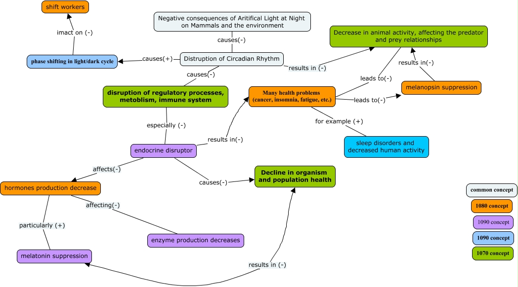 This Concept Map, created with IHMC CmapTools, has information related to: Newest (and hopefully final!), endocrine disruptor affects(-) hormones production decrease, Many health problems (cancer, insomnia, fatigue, etc.) for example (+) sleep disorders and decreased human activity, Distruption of Circadian Rhythm results in (-) Decrease in animal activity, affecting the predator and prey relationships, Decrease in animal activity, affecting the predator and prey relationships leads to(-) Many health problems (cancer, insomnia, fatigue, etc.), melanopsin suppression results in(-) Decrease in animal activity, affecting the predator and prey relationships, endocrine disruptor results in(-) Many health problems (cancer, insomnia, fatigue, etc.), hormones production decrease affecting(-) enzyme production decreases, Distruption of Circadian Rhythm causes(+) phase shifting in light/dark cycle, phase shifting in light/dark cycle imact on (-) shift workers, Negative consequences of Aritifical Light at Night on Mammals and the environment causes(-) Distruption of Circadian Rhythm, disruption of regulatory processes, metoblism, immune system especially (-) endocrine disruptor, endocrine disruptor causes(-) Decline in organism and population health, hormones production decrease particularly (+) melatonin suppression, Many health problems (cancer, insomnia, fatigue, etc.) leads to(-) melanopsin suppression, Distruption of Circadian Rhythm causes(-) disruption of regulatory processes, metoblism, immune system