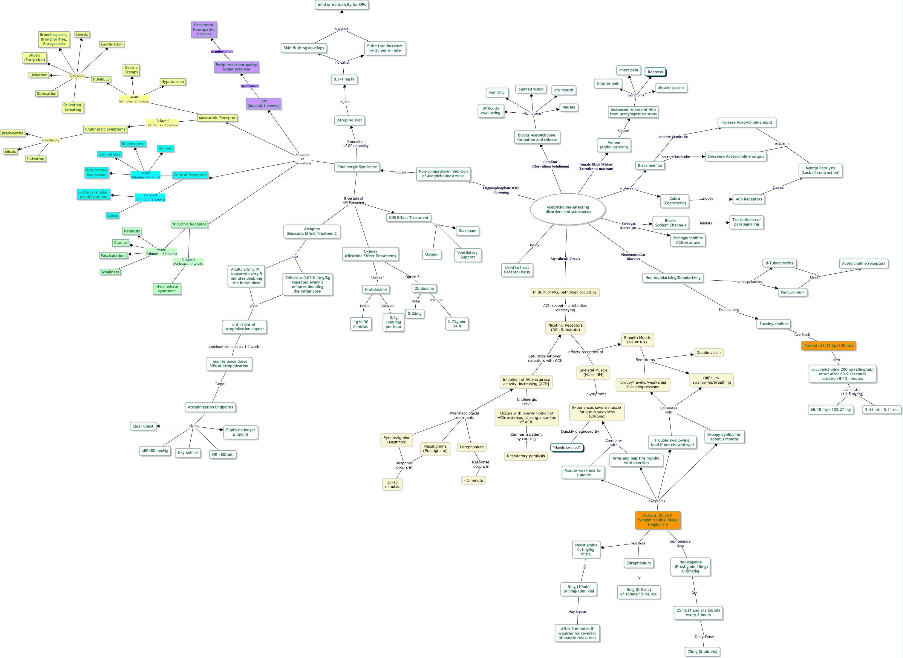 This Concept Map, created with IHMC CmapTools, has information related to: Week 13 Myasthenia Gravis, Black mamba secrete dendroxin Increase Acetylcholine input, Muscarinic Receptor Acute (Minutes -24 hours) Gastric Cramps, Atropinization Endpoints signs Clear Chest, Cholinergic Syndrome If certain of OP Poisoning Oximes (Nicotinic Effect Treatment), Blocks Acetylcholine formation and release Symptoms Difficulty swallowing, Acetylcholine-affecting disorders and substances Sarin gas (Nerve gas) Blocks Sodium Channels, Central Receptors Acute (Minutes-24 hours) Convulsions, Pulse rate increase by 25 per minute suggests mild or no toxicity for OPs, Muscle weakness for 1 month Correlates with Experiences severe muscle fatigue & weakness (Chronic), Atropine Test inject 0.6-1 mg IV, Cholinergic Syndrome Cascade of Symptoms Late (beyond 2 weeks), Oximes (Nicotinic Effect Treatment) Option 1 Pralidoxime, Patient: 20 yo F Weight: 110lbs (50kg) Height: 5'6 Maintenance dose Neostigmine (Prostigmin 15mg) 0.5mg/kg, Muscarinic Receptor Acute (Minutes -24 hours) Hypotension, DUMBELS Symptoms Lacrimation, Non-depolarizing/Depolarizing Nondepolarizing d-Tubocurarine, Acetylcholine-affecting disorders and substances Snake venom Cobra (Cobratoxin), Acetylcholine-affecting disorders and substances Neuromuscular Blockers Non-depolarizing/Depolarizing, ACh Receptors Causes Muscle Paralysis (Lack of contraction), Pancuronium block Acetylcholine receptors