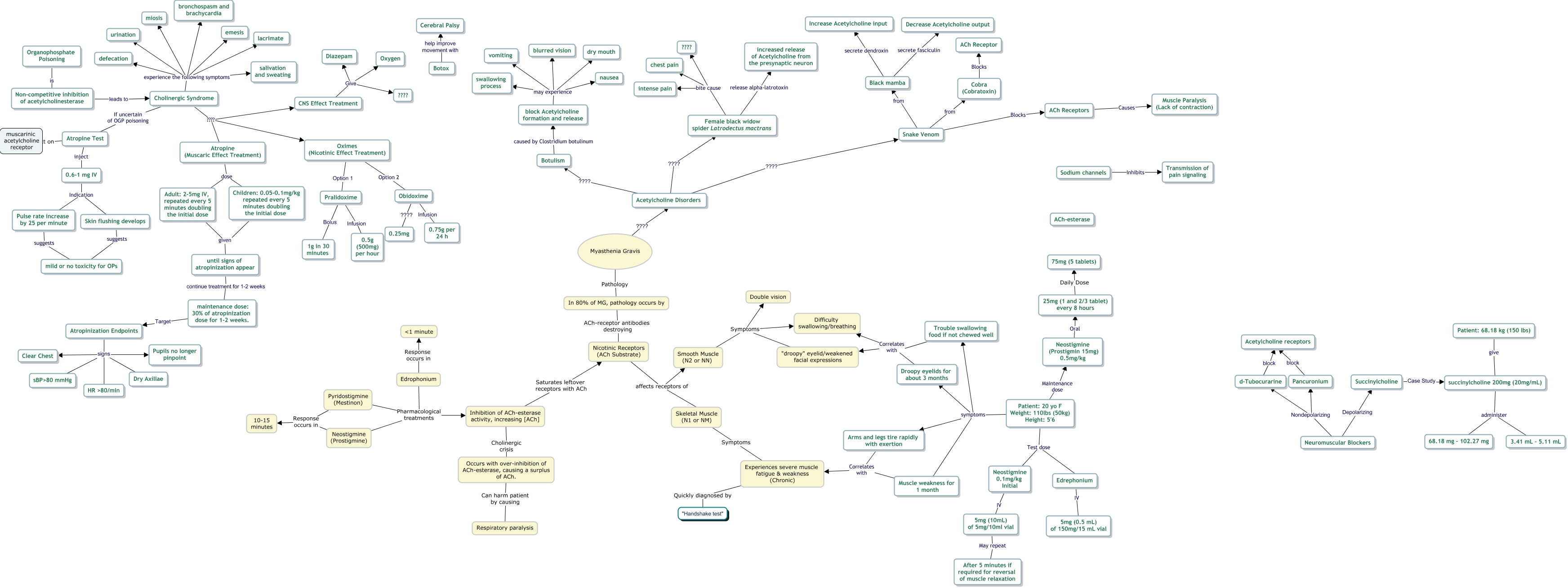 This Concept Map, created with IHMC CmapTools, has information related to: Big Cmap, Muscle weakness for 1 month Correlates with Experiences severe muscle fatigue & weakness (Chronic), Neuromuscular Blockers Depolarizing Succinylcholine, Cholinergic Syndrome experience the following symptoms salivation and sweating, Pralidoxime Bolus 1g in 30 minutes, Sodium channels Inhibits Transmission of pain signaling, Atropine (Muscaric Effect Treatment) dose Adult: 2-5mg IV, repeated every 5 minutes doubling the initial dose, Atropine Test inject 0.6-1 mg IV, CNS Effect Treatment Give Oxygen, Obidoxime ???? 0.25mg, 0.6-1 mg IV Indication Skin flushing develops, Patient: 20 yo F Weight: 110lbs (50kg) Height: 5'6 Maintenance dose Neostigmine (Prostigmin 15mg) 0.5mg/kg, Neostigmine 0.1mg/kg Initial IV 5mg (10mL) of 5mg/10ml vial, Inhibition of ACh-esterase activity, increasing [ACh] Saturates leftover receptors with ACh Nicotinic Receptors (ACh Substrate), Acetylcholine Disorders ???? Female black widow spider Latrodectus mactrans, Cholinergic Syndrome experience the following symptoms miosis, Neuromuscular Blockers Nondepolarizing d-Tubocurarine, Cholinergic Syndrome If uncertain of OGP poisoning Atropine Test, Acetylcholine Disorders ???? Snake Venom, Droopy eyelids for about 3 months Correlates with "droopy" eyelid/weakened facial expressions, Smooth Muscle (N2 or NN) Symptoms Difficulty swallowing/breathing