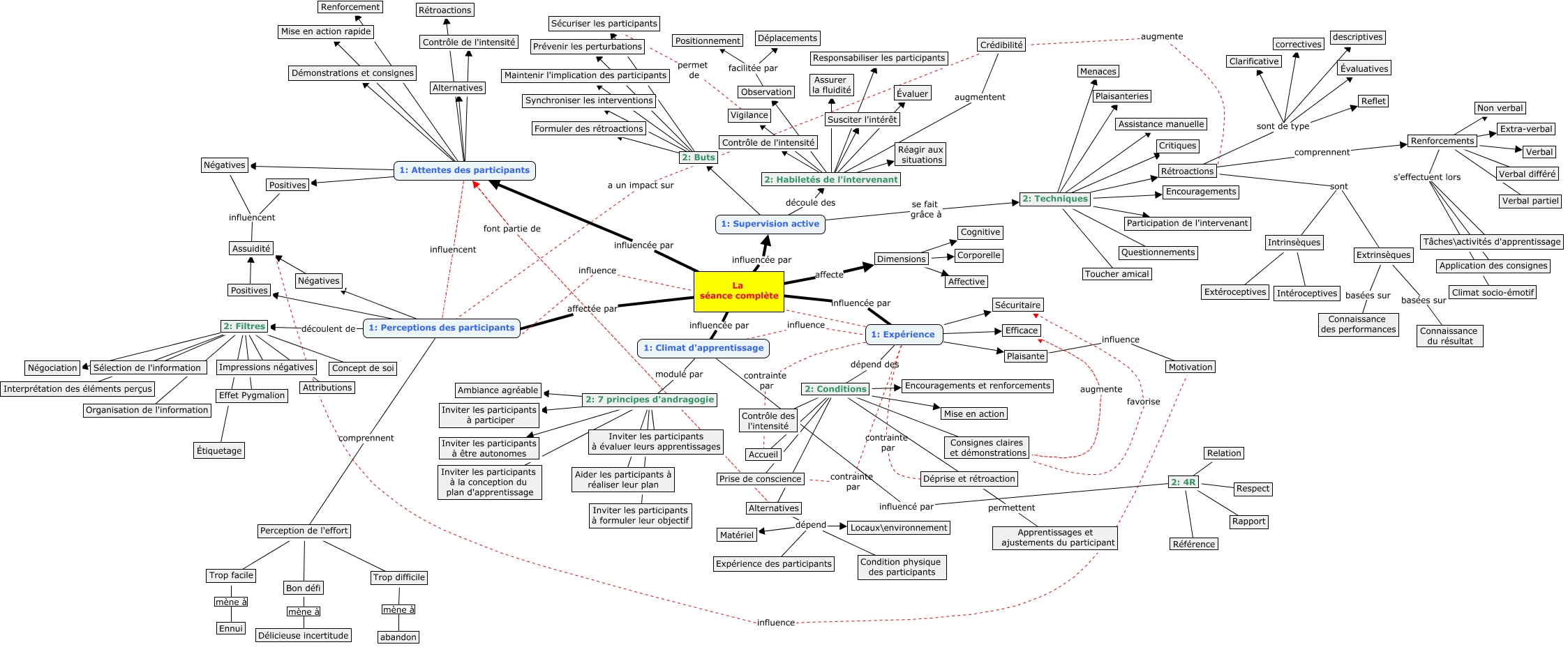 Cette carte de concepts créée avec IHMC CmapTools traite de: Intervention, 2: 7 principes d'andragogie Inviter les participants à participer, La séance complète affectée par 1: Perceptions des participants, Renforcements s'effectuent lors Tâches\activités d'apprentissage, 1: Attentes des participants Mise en action rapide, Perception de l'effort Bon défi, 2: Buts Prévenir les perturbations, Alternatives dépend Matériel, Rétroactions sont de type correctives, 1: Attentes des participants Démonstrations et consignes, 2: Habiletés de l'intervenant Observation, Crédibilité a un impact sur 1: Perceptions des participants, 2: Buts Synchroniser les interventions, 2: Habiletés de l'intervenant Évaluer, 2: Filtres Étiquetage, 1: Attentes des participants Renforcement, Dimensions Affective, 2: Buts Sécuriser les participants, Rétroactions sont de type Évaluatives, 1: Expérience contrainte par Prise de conscience, 2: Habiletés de l'intervenant augmentent Crédibilité