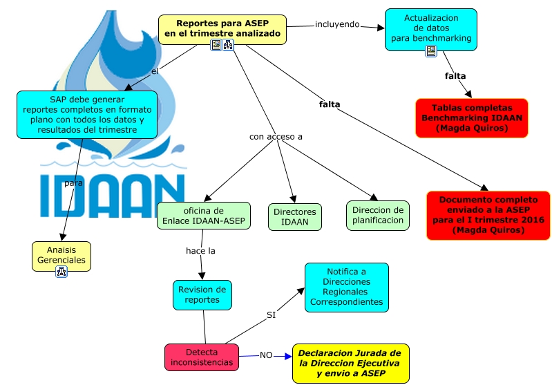 Este Cmap, tiene información relacionada con: reportes, Detecta inconsistencias SI Notifica a Direcciones Regionales Correspondientes, Reportes para ASEP en el trimestre analizado con acceso a oficina de Enlace IDAAN-ASEP, Revision de reportes ???? Detecta inconsistencias, Reportes para ASEP en el trimestre analizado con acceso a Direccion de planificacion, Reportes para ASEP en el trimestre analizado con acceso a Directores IDAAN, Detecta inconsistencias NO Declaracion Jurada de la Direccion Ejecutiva y envio a ASEP, Reportes para ASEP en el trimestre analizado incluyendo Actualizacion de datos para benchmarking, oficina de Enlace IDAAN-ASEP hace la Revision de reportes, Actualizacion de datos para benchmarking falta Tablas completas Benchmarking IDAAN (Magda Quiros), SAP debe generar reportes completos en formato plano con todos los datos y resultados del trimestre para Anaisis Gerenciales, Reportes para ASEP en el trimestre analizado falta Documento completo enviado a la ASEP para el I trimestre 2016 (Magda Quiros), Reportes para ASEP en el trimestre analizado el SAP debe generar reportes completos en formato plano con todos los datos y resultados del trimestre