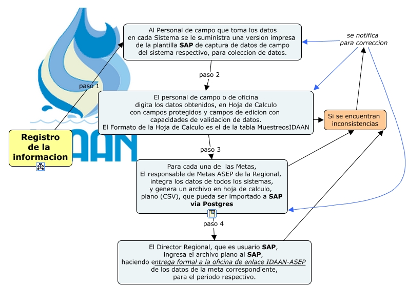 Este Cmap, tiene información relacionada con: registro_informacion, Al Personal de campo que toma los datos en cada Sistema se le suministra una version impresa de la plantilla SAP de captura de datos de campo del sistema respectivo, para coleccion de datos. paso 2 El personal de campo o de oficina digita los datos obtenidos, en Hoja de Calculo con campos protegidos y campos de edicion con capacidades de validacion de datos. El Formato de la Hoja de Calculo es el de la tabla MuestreosIDAAN, El Director Regional, que es usuario SAP, ingresa el archivo plano al SAP, haciendo entrega formal a la oficina de enlace IDAAN-ASEP de los datos de la meta correspondiente, para el periodo respectivo. ???? Si se encuentran inconsistencias, Si se encuentran inconsistencias se notifica para correccion Al Personal de campo que toma los datos en cada Sistema se le suministra una version impresa de la plantilla SAP de captura de datos de campo del sistema respectivo, para coleccion de datos., Registro de la informacion paso 1 Al Personal de campo que toma los datos en cada Sistema se le suministra una version impresa de la plantilla SAP de captura de datos de campo del sistema respectivo, para coleccion de datos., Si se encuentran inconsistencias se notifica para correccion El personal de campo o de oficina digita los datos obtenidos, en Hoja de Calculo con campos protegidos y campos de edicion con capacidades de validacion de datos. El Formato de la Hoja de Calculo es el de la tabla MuestreosIDAAN, Para cada una de las Metas, El responsable de Metas ASEP de la Regional, integra los datos de todos los sistemas, y genera un archivo en hoja de calculo, plano (CSV), que pueda ser importado a SAP via Postgres ???? Si se encuentran inconsistencias, Para cada una de las Metas, El responsable de Metas ASEP de la Regional, integra los datos de todos los sistemas, y genera un archivo en hoja de calculo, plano (CSV), que pueda ser importado a SAP via Postgres paso 4 El Director Regional, que es usuario SAP, ingresa el archivo plano al SAP, haciendo entrega formal a la oficina de enlace IDAAN-ASEP de los datos de la meta correspondiente, para el periodo respectivo., Si se encuentran inconsistencias se notifica para correccion Para cada una de las Metas, El responsable de Metas ASEP de la Regional, integra los datos de todos los sistemas, y genera un archivo en hoja de calculo, plano (CSV), que pueda ser importado a SAP via Postgres, El personal de campo o de oficina digita los datos obtenidos, en Hoja de Calculo con campos protegidos y campos de edicion con capacidades de validacion de datos. El Formato de la Hoja de Calculo es el de la tabla MuestreosIDAAN paso 3 Para cada una de las Metas, El responsable de Metas ASEP de la Regional, integra los datos de todos los sistemas, y genera un archivo en hoja de calculo, plano (CSV), que pueda ser importado a SAP via Postgres, El personal de campo o de oficina digita los datos obtenidos, en Hoja de Calculo con campos protegidos y campos de edicion con capacidades de validacion de datos. El Formato de la Hoja de Calculo es el de la tabla MuestreosIDAAN ???? Si se encuentran inconsistencias