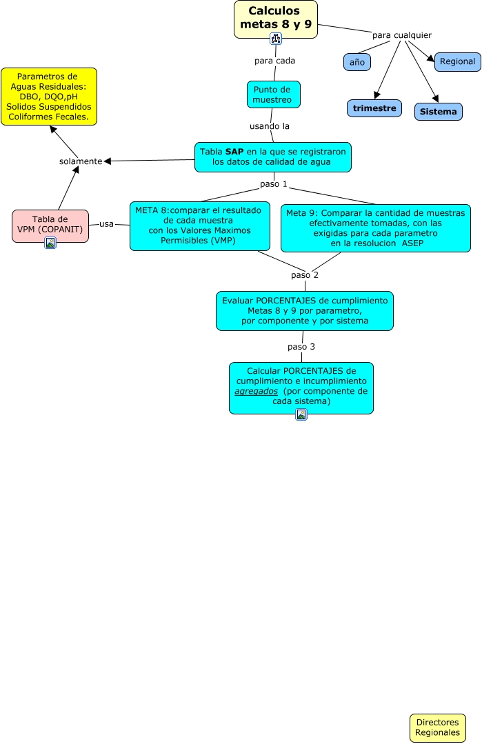 Este Cmap, tiene información relacionada con: calculos_metas8_9, Tabla SAP en la que se registraron los datos de calidad de agua paso 1 META 8:comparar el resultado de cada muestra con los Valores Maximos Permisibles (VMP), Calculos metas 8 y 9 para cualquier Sistema, Calculos metas 8 y 9 para cualquier año, Punto de muestreo usando la Tabla SAP en la que se registraron los datos de calidad de agua, Tabla SAP en la que se registraron los datos de calidad de agua solamente Parametros de Aguas Residuales: DBO, DQO,pH Solidos Suspendidos Coliformes Fecales., Evaluar PORCENTAJES de cumplimiento Metas 8 y 9 por parametro, por componente y por sistema paso 3 Calcular PORCENTAJES de cumplimiento e incumplimiento agregados (por componente de cada sistema), Tabla de VPM (COPANIT) solamente Parametros de Aguas Residuales: DBO, DQO,pH Solidos Suspendidos Coliformes Fecales., Calculos metas 8 y 9 para cada Punto de muestreo, Tabla SAP en la que se registraron los datos de calidad de agua paso 1 Meta 9: Comparar la cantidad de muestras efectivamente tomadas, con las exigidas para cada parametro en la resolucion ASEP, Meta 9: Comparar la cantidad de muestras efectivamente tomadas, con las exigidas para cada parametro en la resolucion ASEP paso 2 Evaluar PORCENTAJES de cumplimiento Metas 8 y 9 por parametro, por componente y por sistema, META 8:comparar el resultado de cada muestra con los Valores Maximos Permisibles (VMP) usa Tabla de VPM (COPANIT), META 8:comparar el resultado de cada muestra con los Valores Maximos Permisibles (VMP) paso 2 Evaluar PORCENTAJES de cumplimiento Metas 8 y 9 por parametro, por componente y por sistema, Calculos metas 8 y 9 para cualquier Regional, Calculos metas 8 y 9 para cualquier trimestre
