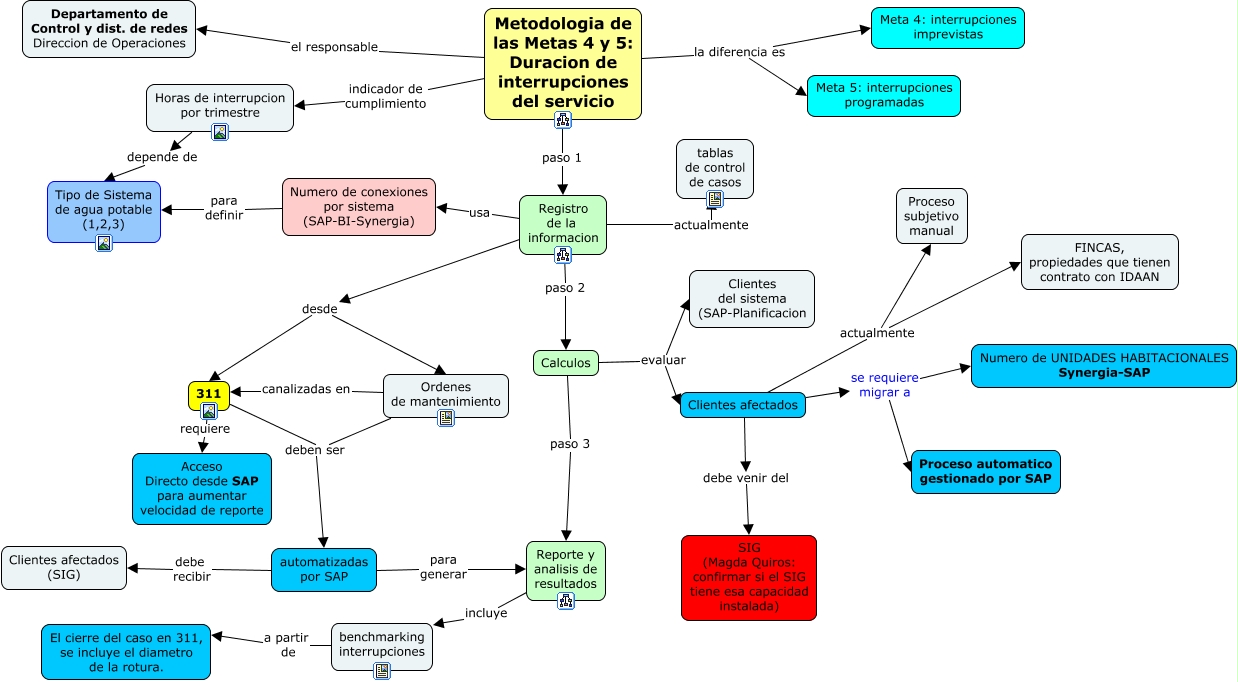 Este Cmap, tiene información relacionada con: Metodologia Metas4_5, Ordenes de mantenimiento deben ser automatizadas por SAP, Registro de la informacion desde 311, Registro de la informacion usa Numero de conexiones por sistema (SAP-BI-Synergia), Clientes afectados actualmente Proceso subjetivo manual, 311 requiere Acceso Directo desde SAP para aumentar velocidad de reporte, Calculos evaluar Clientes del sistema (SAP-Planificacion, Metodologia de las Metas 4 y 5: Duracion de interrupciones del servicio el responsable Departamento de Control y dist. de redes Direccion de Operaciones, Metodologia de las Metas 4 y 5: Duracion de interrupciones del servicio la diferencia es Meta 5: interrupciones programadas, benchmarking interrupciones a partir de El cierre del caso en 311, se incluye el diametro de la rotura., Registro de la informacion actualmente tablas de control de casos, Metodologia de las Metas 4 y 5: Duracion de interrupciones del servicio paso 1 Registro de la informacion, Registro de la informacion desde Ordenes de mantenimiento, Metodologia de las Metas 4 y 5: Duracion de interrupciones del servicio la diferencia es Meta 4: interrupciones imprevistas, Metodologia de las Metas 4 y 5: Duracion de interrupciones del servicio indicador de cumplimiento Horas de interrupcion por trimestre, automatizadas por SAP para generar Reporte y analisis de resultados, Horas de interrupcion por trimestre depende de Tipo de Sistema de agua potable (1,2,3), automatizadas por SAP debe recibir Clientes afectados (SIG), Clientes afectados debe venir del SIG (Magda Quiros: confirmar si el SIG tiene esa capacidad instalada), Calculos evaluar Clientes afectados, Clientes afectados se requiere migrar a Numero de UNIDADES HABITACIONALES Synergia-SAP