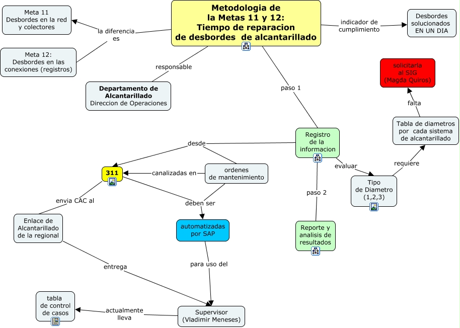 Este Cmap, tiene información relacionada con: Metodologia Metas 11_12, Supervisor (Vladimir Meneses) actualmente lleva tabla de control de casos, Metodologia de la Metas 11 y 12: Tiempo de reparacion de desbordes de alcantarillado la diferencia es Meta 11 Desbordes en la red y colectores, Metodologia de la Metas 11 y 12: Tiempo de reparacion de desbordes de alcantarillado paso 1 Registro de la informacion, Metodologia de la Metas 11 y 12: Tiempo de reparacion de desbordes de alcantarillado la diferencia es Meta 12: Desbordes en las conexiones (registros), 311 envia CAC al Enlace de Alcantarillado de la regional, Tipo de Diametro (1,2,3) requiere Tabla de diametros por cada sistema de alcantarillado, automatizadas por SAP para uso del Supervisor (Vladimir Meneses), Registro de la informacion paso 2 Reporte y analisis de resultados, 311 deben ser automatizadas por SAP, ordenes de mantenimiento deben ser automatizadas por SAP, Metodologia de la Metas 11 y 12: Tiempo de reparacion de desbordes de alcantarillado responsable Departamento de Alcantarillado Direccion de Operaciones, Tabla de diametros por cada sistema de alcantarillado falta solicitarla al SIG (Magda Quiros), ordenes de mantenimiento canalizadas en 311, Registro de la informacion desde 311, Enlace de Alcantarillado de la regional entrega Supervisor (Vladimir Meneses), Registro de la informacion evaluar Tipo de Diametro (1,2,3), Registro de la informacion desde ordenes de mantenimiento, Metodologia de la Metas 11 y 12: Tiempo de reparacion de desbordes de alcantarillado indicador de cumplimiento Desbordes solucionados EN UN DIA