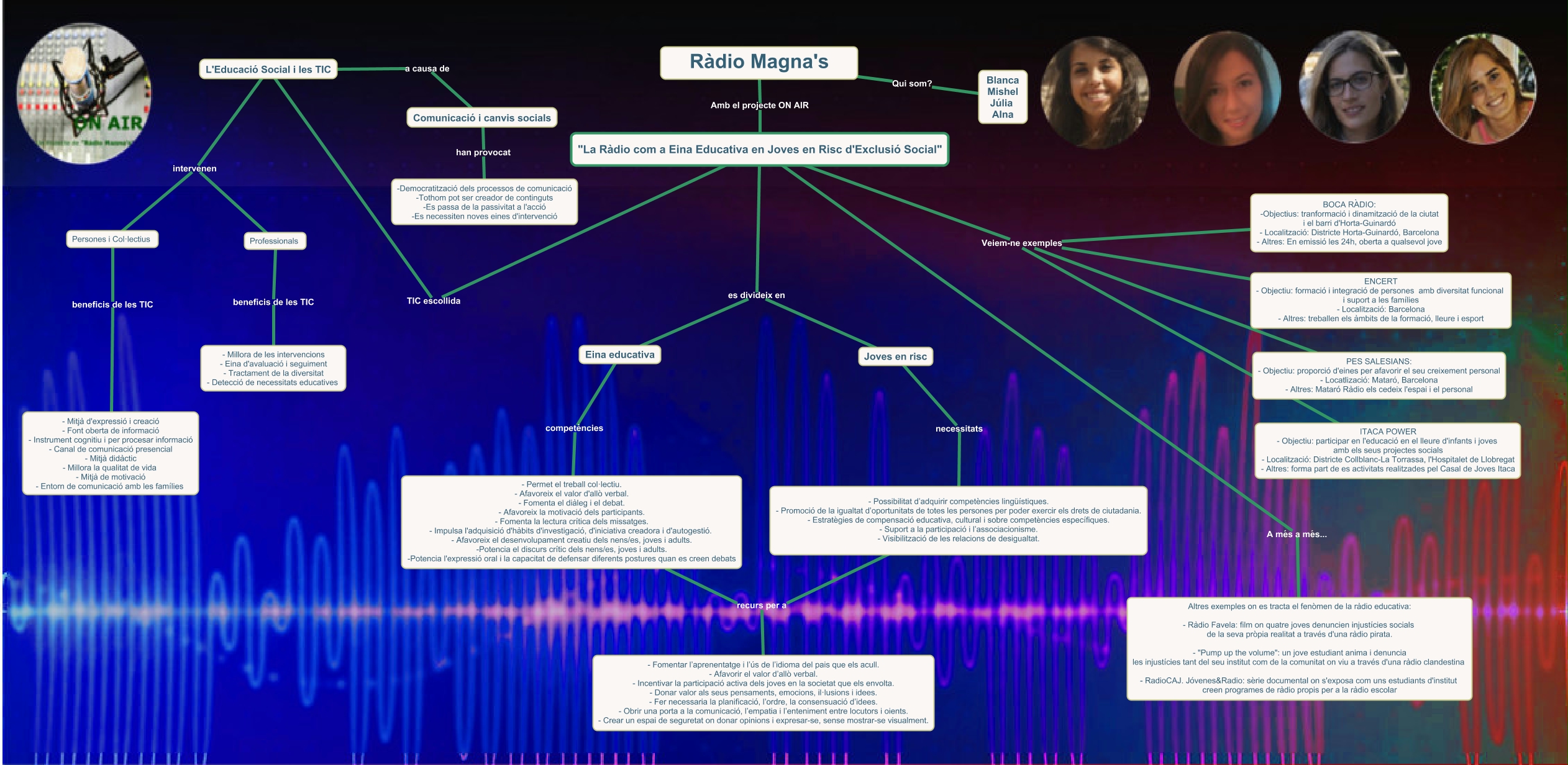 Aquest mapa conceptual conté informació relacionada amb: ON AIR. CMAP RadioMagnas, L'Educació Social i les TIC intervenen Professionals, ENCERT - Objectiu: formació i integració de persones amb diversitat funcional i suport a les famílies - Localització: Barcelona - Altres: treballen els àmbits de la formació, lleure i esport Veiem-ne exemples BOCA RÀDIO: -Objectius: tranformació i dinamització de la ciutat i el barri d'Horta-Guinardó - Localització: Districte Horta-Guinardó, Barcelona - Altres: En emissió les 24h, oberta a qualsevol jove, ITACA POWER - Objectiu: participar en l'educació en el lleure d'infants i joves amb els seus projectes socials - Localització: Districte Collblanc-La Torrassa, l'Hospitalet de Llobregat - Altres: forma part de es activitats realitzades pel Casal de Joves Itaca Veiem-ne exemples BOCA RÀDIO: -Objectius: tranformació i dinamització de la ciutat i el barri d'Horta-Guinardó - Localització: Districte Horta-Guinardó, Barcelona - Altres: En emissió les 24h, oberta a qualsevol jove, Persones i Col·lectius intervenen Professionals, - Possibilitat d’adquirir competències lingüístiques. - Promoció de la igualtat d’oportunitats de totes les persones per poder exercir els drets de ciutadania. - Estratègies de compensació educativa, cultural i sobre competències específiques. - Suport a la participació i l’associacionisme. - Visibilització de les relacions de desigualtat. recurs per a - Fomentar l’aprenentatge i l’ús de l’idioma del pais que els acull. - Afavorir el valor d’allò verbal. - Incentivar la participació activa dels joves en la societat que els envolta. - Donar valor als seus pensaments, emocions, il·lusions i idees. - Fer necessaria la planificació, l’ordre, la consensuació d’idees. - Obrir una porta a la comunicació, l’empatia i l’enteniment entre locutors i oients. - Crear un espai de seguretat on donar opinions i expresar-se, sense mostrar-se visualment., Persones i Col·lectius beneficis de les TIC - Mitjà d'expressió i creació - Font oberta de informació - Instrument cognitiu i per procesar informació - Canal de comunicació presencial - Mitjà didàctic - Millora la qualitat de vida - Mitjà de motivació - Entorn de comunicació amb les famílies, "La Ràdio com a Eina Educativa en Joves en Risc d'Exclusió Social" es divideix en Joves en risc, Professionals beneficis de les TIC - Millora de les intervencions - Eina d'avaluació i seguiment - Tractament de la diversitat - Detecció de necessitats educatives, "La Ràdio com a Eina Educativa en Joves en Risc d'Exclusió Social" es divideix en Eina educativa, Ràdio Magna's Qui som? Blanca Mishel Júlia AIna, PES SALESIANS: - Objectiu: proporció d'eines per afavorir el seu creixement personal - Locatlizació: Mataró, Barcelona - Altres: Mataró Ràdio els cedeix l'espai i el personal Veiem-ne exemples BOCA RÀDIO: -Objectius: tranformació i dinamització de la ciutat i el barri d'Horta-Guinardó - Localització: Districte Horta-Guinardó, Barcelona - Altres: En emissió les 24h, oberta a qualsevol jove, Joves en risc necessitats - Possibilitat d’adquirir competències lingüístiques. - Promoció de la igualtat d’oportunitats de totes les persones per poder exercir els drets de ciutadania. - Estratègies de compensació educativa, cultural i sobre competències específiques. - Suport a la participació i l’associacionisme. - Visibilització de les relacions de desigualtat., Comunicació i canvis socials han provocat -Democratització dels processos de comunicació -Tothom pot ser creador de continguts -Es passa de la passivitat a l'acció -Es necessiten noves eines d'intervenció, "La Ràdio com a Eina Educativa en Joves en Risc d'Exclusió Social" Amb el projecte ON AIR Ràdio Magna's, Eina educativa competències - Permet el treball col·lectiu. - Afavoreix el valor d'allò verbal. - Fomenta el diàleg i el debat. - Afavoreix la motivació dels participants. - Fomenta la lectura crítica dels missatges. - Impulsa l'adquisició d'hàbits d'investigació, d'iniciativa creadora i d'autogestió. - Afavoreix el desenvolupament creatiu dels nens/es, joves i adults. -Potencia el discurs crític dels nens/es, joves i adults. -Potencia l'expressió oral i la capacitat de defensar diferents postures quan es creen debats, "La Ràdio com a Eina Educativa en Joves en Risc d'Exclusió Social" TIC escollida L'Educació Social i les TIC, - Permet el treball col·lectiu. - Afavoreix el valor d'allò verbal. - Fomenta el diàleg i el debat. - Afavoreix la motivació dels participants. - Fomenta la lectura crítica dels missatges. - Impulsa l'adquisició d'hàbits d'investigació, d'iniciativa creadora i d'autogestió. - Afavoreix el desenvolupament creatiu dels nens/es, joves i adults. -Potencia el discurs crític dels nens/es, joves i adults. -Potencia l'expressió oral i la capacitat de defensar diferents postures quan es creen debats recurs per a - Fomentar l’aprenentatge i l’ús de l’idioma del pais que els acull. - Afavorir el valor d’allò verbal. - Incentivar la participació activa dels joves en la societat que els envolta. - Donar valor als seus pensaments, emocions, il·lusions i idees. - Fer necessaria la planificació, l’ordre, la consensuació d’idees. - Obrir una porta a la comunicació, l’empatia i l’enteniment entre locutors i oients. - Crear un espai de seguretat on donar opinions i expresar-se, sense mostrar-se visualment., "La Ràdio com a Eina Educativa en Joves en Risc d'Exclusió Social" Veiem-ne exemples BOCA RÀDIO: -Objectius: tranformació i dinamització de la ciutat i el barri d'Horta-Guinardó - Localització: Districte Horta-Guinardó, Barcelona - Altres: En emissió les 24h, oberta a qualsevol jove, "La Ràdio com a Eina Educativa en Joves en Risc d'Exclusió Social" A més a més... Altres exemples on es tracta el fenòmen de la ràdio educativa: - Ràdio Favela: film on quatre joves denunci