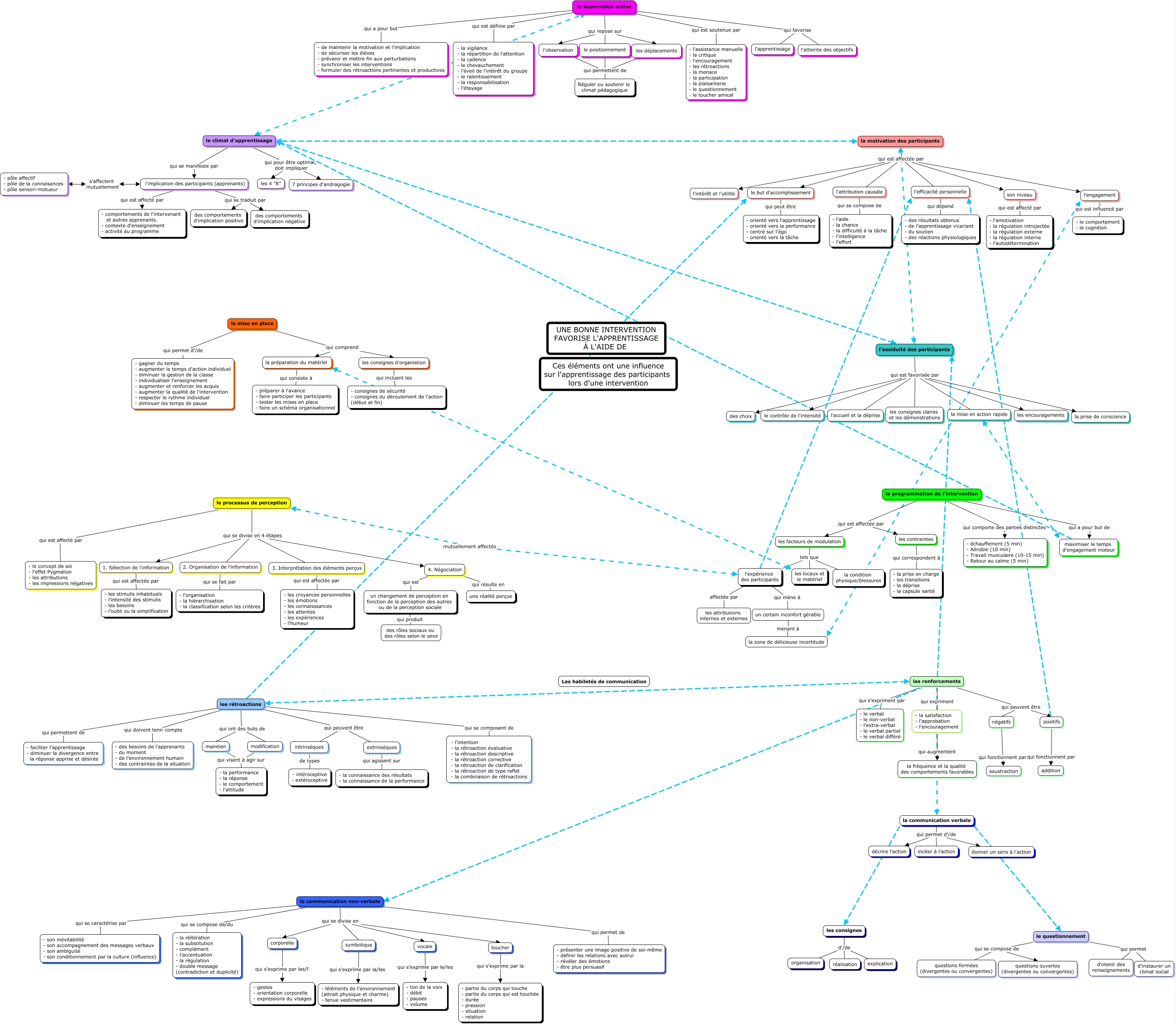 This Concept Map, created with IHMC CmapTools, has information related to: schématisation 2 Gab, l'expérience des participants affectée par les attributions internes et externes, le but d'accomplissement qui peut être - orienté vers l'apprentissage - orienté vers la performance - centré sur l'égo - orienté vers la tâche, la supervision active qui favorise l'atteinte des objectifs, corporelle qui s'exprime par les/l' - gestes - orientation corporelle - expressions du visages, son niveau qui est affecté par - l'amotivation - la régulation introjectée - la régulation externe - la régulation interne - l'autodétermination, les rétroactions le but d'accomplissement, la communication verbale qui permet d'/de inciter à l'action, les facteurs de modulation tels que la condition physique/blessures, les consignes d'organistion qui incluent les - consignes de sécurité - consignes du déroulement de l'action (début et fin), la communication verbale les consignes, le questionnement qui permet d'otenir des renseignements, le processus de perception qui se divise en 4 étapes 3. Interprétation des éléments perçus, la mise en action rapide maximiser le temps d'engagement moteur, les renforcements l'assiduité des participants, la communication non-verbale qui se divise en vocale, la mise en place qui comprend la préparation du matériel, vocale qui s'exprime par le/les - ton de la voix - débit - pauses - volume, 4. Négociation qui résulte en une réalité perçue, la mise en place qui permet d'/de - gagner du temps - augmenter le temps d'action individuel - diminuer la gestion de la classe - individualiser l'enseignement - augmenter et renforcer les acquis - augmenter la qualité de l'intervention - respecter le rythme individuel - diminuer les temps de pause, la communication verbale le questionnement