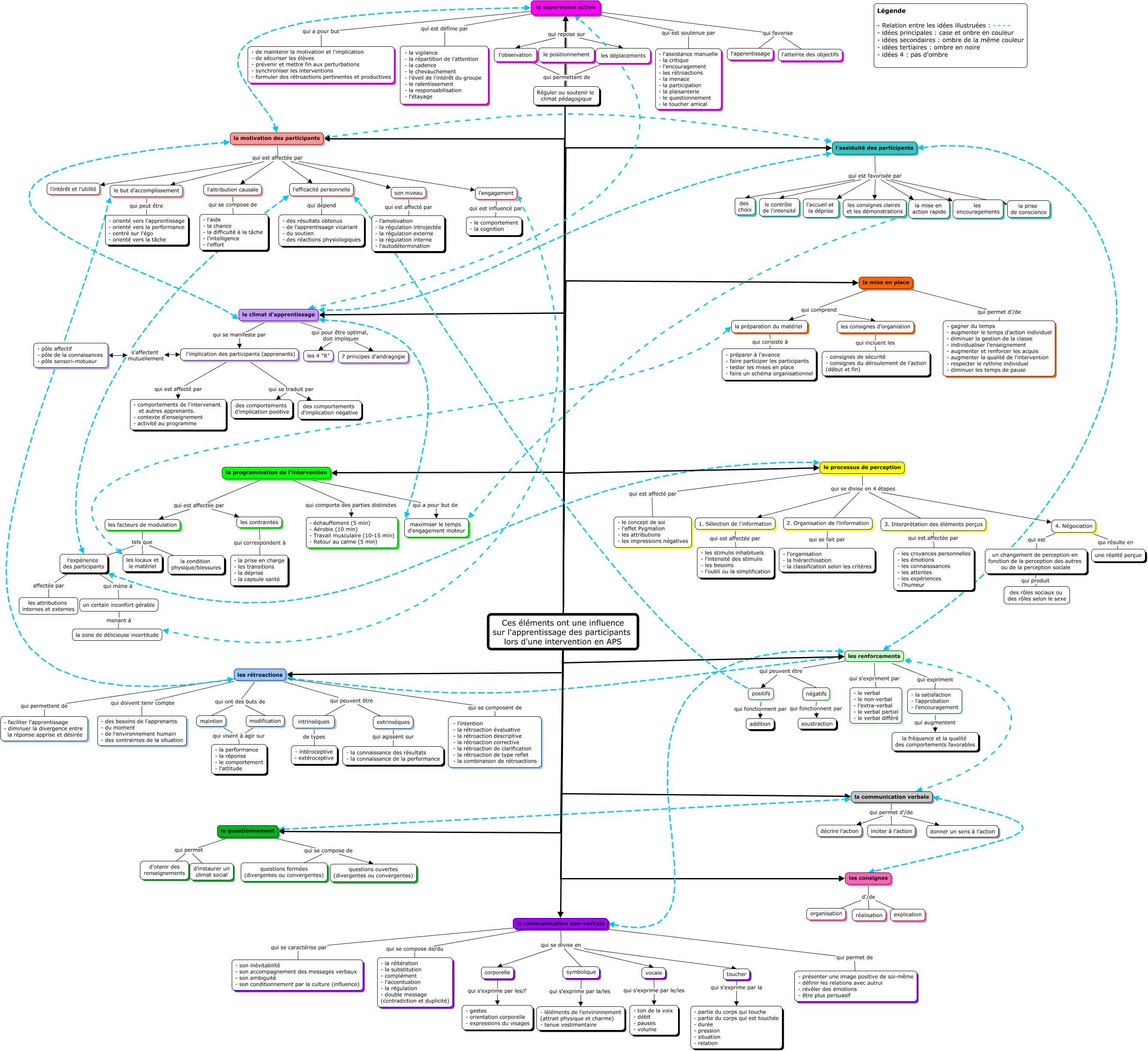 Cette carte de concepts créée avec IHMC CmapTools traite de: schématisation 3, les renforcements l'assiduité des participants, l'implication des participants (apprenants) qui se traduit par des comportements d'implication positive, les facteurs de modulation tels que les locaux et le matériel, corporelle qui s'exprime par les/l' - gestes - orientation corporelle - expressions du visages, l'expérience des participants l'efficacité personnelle, l'implication des participants (apprenants) qui est affecté par - comportements de l'intervenant et autres apprenants. - contexte d'enseignement - activité au programme, maximiser le temps d'engagement moteur le climat d'apprentissage, la supervision active la motivation des participants, les rétroactions qui permettent de - faciliter l'apprentissage - diminuer la divergence entre la réponse apprise et désirée, 2. Organisation de l'information qui se fait par - l'organisation - la hiérarchisation - la classification selon les critères, les renforcements qui expriment - la satisfaction - l'approbation - l'encouragement, la supervision active qui est soutenue par - l'assistance manuelle - la critique - l'encouragement - les rétroactions - la menace - la participation - la plaisanterie - le questionnement - le toucher amical, les renforcements qui s'expriment par - le verbal - le non-verbal - l'extra-verbal - le verbal partiel - le verbal différé, positifs l'efficacité personnelle, l'implication des participants (apprenants) qui se traduit par des comportements d'implication négative, la mise en place qui comprend la préparation du matériel, l'implication des participants (apprenants) s'affectent mutuellement - pôle affectif - pôle de la connaisances - pôle sensori-motueur, toucher qui s'exprime par la - partie du corps qui touche - partie du corps qui est touchée - durée - pression - situation - relation, la communication non-verbale qui se caractérise par - son inévitabilité - son accompagnement des messages verbaux - son ambiguité - son conditionnement par la culture (influence), la mise en place qui comprend les consignes d'organistion