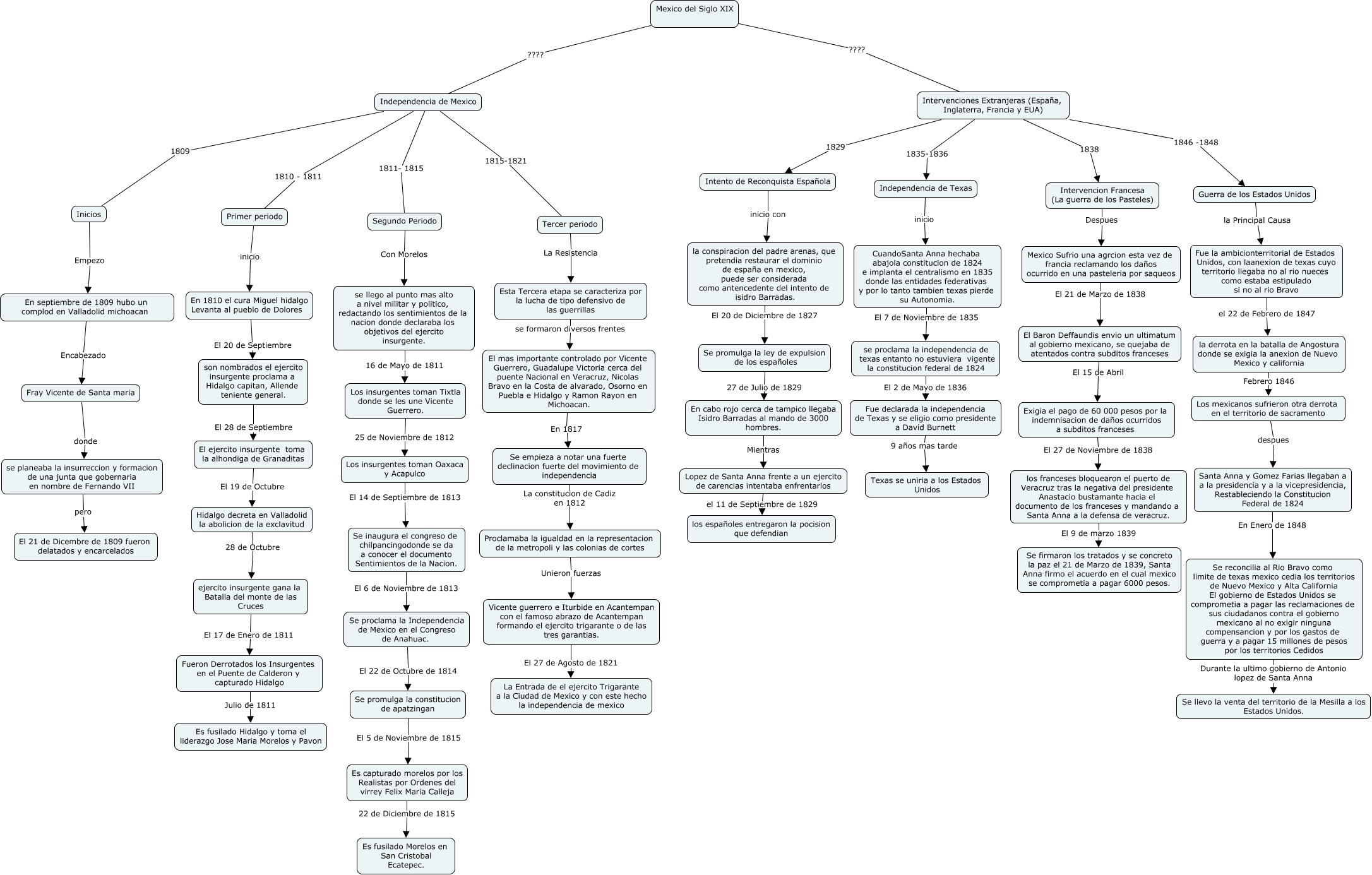 Este Cmap, tiene información relacionada con: mexico, CuandoSanta Anna hechaba abajola constitucion de 1824 e implanta el centralismo en 1835 donde las entidades federativas y por lo tanto tambien texas pierde su Autonomia. El 7 de Noviembre de 1835 se proclama la independencia de texas entanto no estuviera vigente la constitucion federal de 1824, Exigia el pago de 60 000 pesos por la indemnisacion de daños ocurridos a subditos franceses El 27 de Noviembre de 1838 los franceses bloquearon el puerto de Veracruz tras la negativa del presidente Anastacio bustamante hacia el documento de los franceses y mandando a Santa Anna a la defensa de veracruz., Tercer periodo La Resistencia Esta Tercera etapa se caracteriza por la lucha de tipo defensivo de las guerrillas, Inicios Empezo En septiembre de 1809 hubo un complod en Valladolid michoacan, Hidalgo decreta en Valladolid la abolicion de la exclavitud 28 de Octubre ejercito insurgente gana la Batalla del monte de las Cruces, se llego al punto mas alto a nivel militar y politico, redactando los sentimientos de la nacion donde declaraba los objetivos del ejercito insurgente. 16 de Mayo de 1811 Los insurgentes toman Tixtla donde se les une Vicente Guerrero., El mas importante controlado por Vicente Guerrero, Guadalupe Victoria cerca del puente Nacional en Veracruz, Nicolas Bravo en la Costa de alvarado, Osorno en Puebla e Hidalgo y Ramon Rayon en Michoacan. En 1817 Se empieza a notar una fuerte declinacion fuerte del movimiento de independencia, Se reconcilia al Rio Bravo como limite de texas mexico cedia los territorios de Nuevo Mexico y Alta California El gobierno de Estados Unidos se comprometia a pagar las reclamaciones de sus ciudadanos contra el gobierno mexicano al no exigir ninguna compensancion y por los gastos de guerra y a pagar 15 millones de pesos por los territorios Cedidos Durante la ultimo gobierno de Antonio lopez de Santa Anna Se llevo la venta del territorio de la Mesilla a los Estados Unidos., Santa Anna y Gomez Farias llegaban a a la presidencia y a la vicepresidencia, Restableciendo la Constitucion Federal de 1824 En Enero de 1848 Se reconcilia al Rio Bravo como limite de texas mexico cedia los territorios de Nuevo Mexico y Alta California El gobierno de Estados Unidos se comprometia a pagar las reclamaciones de sus ciudadanos contra el gobierno mexicano al no exigir ninguna compensancion y por los gastos de guerra y a pagar 15 millones de pesos por los territorios Cedidos, Intervenciones Extranjeras (España, Inglaterra, Francia y EUA) 1829 Intento de Reconquista Española, Fue la ambicionterritorial de Estados Unidos, con laanexion de texas cuyo territorio llegaba no al rio nueces como estaba estipulado si no al rio Bravo el 22 de Febrero de 1847 la derrota en la batalla de Angostura donde se exigia la anexion de Nuevo Mexico y california, son nombrados el ejercito insurgente proclama a Hidalgo capitan, Allende teniente general. El 28 de Septiembre El ejercito insurgente toma la alhondiga de Granaditas, Vicente guerrero e Iturbide en Acantempan con el famoso abrazo de Acantempan formando el ejercito trigarante o de las tres garantias. El 27 de Agosto de 1821 La Entrada de el ejercito Trigarante a la Ciudad de Mexico y con este hecho la independencia de mexico, Se promulga la constitucion de apatzingan El 5 de Noviembre de 1815 Es capturado morelos por los Realistas por Ordenes del virrey Felix Maria Calleja, ejercito insurgente gana la Batalla del monte de las Cruces El 17 de Enero de 1811 Fueron Derrotados los Insurgentes en el Puente de Calderon y capturado Hidalgo, Esta Tercera etapa se caracteriza por la lucha de tipo defensivo de las guerrillas se formaron diversos frentes El mas importante controlado por Vicente Guerrero, Guadalupe Victoria cerca del puente Nacional en Veracruz, Nicolas Bravo en la Costa de alvarado, Osorno en Puebla e Hidalgo y Ramon Rayon en Michoacan., Proclamaba la igualdad en la representacion de la metropoli y las colonias de cortes Unieron fuerzas Vicente guerrero e Iturbide en Acantempan con el famoso abrazo de Acantempan formando el ejercito trigarante o de las tres garantias., se planeaba la insurreccion y formacion de una junta que gobernaria en nombre de Fernando VII pero El 21 de Dicembre de 1809 fueron delatados y encarcelados, Independencia de Texas inicio CuandoSanta Anna hechaba abajola constitucion de 1824 e implanta el centralismo en 1835 donde las entidades federativas y por lo tanto tambien texas pierde su Autonomia., Es capturado morelos por los Realistas por Ordenes del virrey Felix Maria Calleja 22 de Diciembre de 1815 Es fusilado Morelos en San Cristobal Ecatepec.