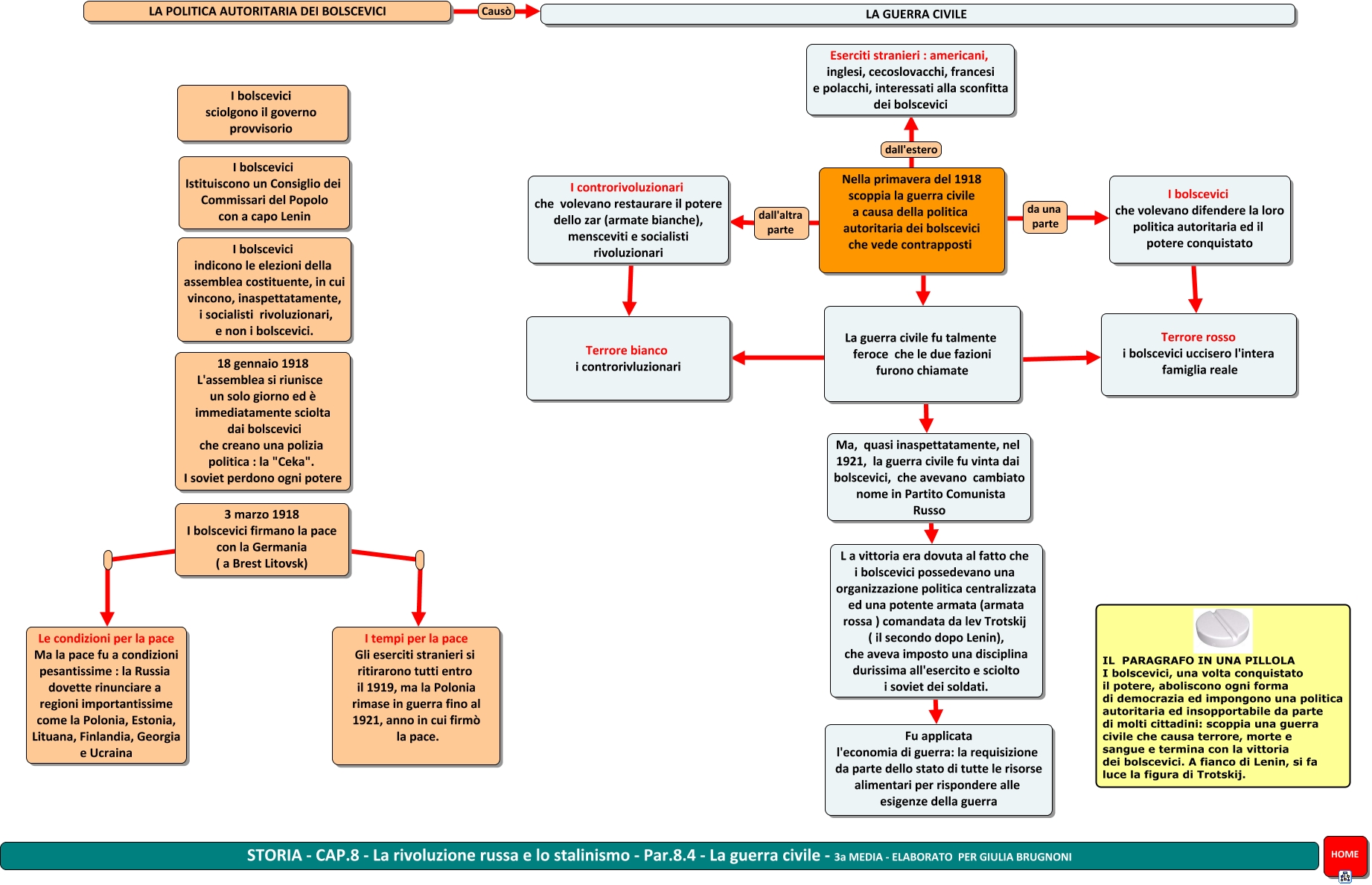Questa Cmap, creata con IHMC CmapTools, contiene informazioni relative a: STORIA - Par.8.4 - La guerra civile - GB 3a media, Nella primavera del 1918 scoppia la guerra civile a causa della politica autoritaria dei bolscevici che vede contrapposti dall'estero Eserciti stranieri : americani, inglesi, cecoslovacchi, francesi e polacchi, interessati alla sconfitta dei bolscevici, 3 marzo 1918 I bolscevici firmano la pace con la Germania ( a Brest Litovsk) I tempi per la pace Gli eserciti stranieri si ritirarono tutti entro il 1919, ma la Polonia rimase in guerra fino al 1921, anno in cui firmò la pace., L a vittoria era dovuta al fatto che i bolscevici possedevano una organizzazione politica centralizzata ed una potente armata (armata rossa ) comandata da lev Trotskij ( il secondo dopo Lenin), che aveva imposto una disciplina durissima all'esercito e sciolto i soviet dei soldati. ???? Fu applicata l'economia di guerra: la requisizione da parte dello stato di tutte le risorse alimentari per rispondere alle esigenze della guerra, I controrivoluzionari che volevano restaurare il potere dello zar (armate bianche), mensceviti e socialisti rivoluzionari ???? Terrore bianco i controrivluzionari, LA POLITICA AUTORITARIA DEI BOLSCEVICI Causò LA GUERRA CIVILE, Ma, quasi inaspettatamente, nel 1921, la guerra civile fu vinta dai bolscevici, che avevano cambiato nome in Partito Comunista Russo ???? L a vittoria era dovuta al fatto che i bolscevici possedevano una organizzazione politica centralizzata ed una potente armata (armata rossa ) comandata da lev Trotskij ( il secondo dopo Lenin), che aveva imposto una disciplina durissima all'esercito e sciolto i soviet dei soldati., 3 marzo 1918 I bolscevici firmano la pace con la Germania ( a Brest Litovsk) Le condizioni per la pace Ma la pace fu a condizioni pesantissime : la Russia dovette rinunciare a regioni importantissime come la Polonia, Estonia, Lituana, Finlandia, Georgia e Ucraina, Nella primavera del 1918 scoppia la guerra civile a causa della politica autoritaria dei bolscevici che vede contrapposti ???? La guerra civile fu talmente feroce che le due fazioni furono chiamate, La guerra civile fu talmente feroce che le due fazioni furono chiamate ???? Terrore rosso i bolscevici uccisero l'intera famiglia reale, I bolscevici che volevano difendere la loro politica autoritaria ed il potere conquistato ???? Terrore rosso i bolscevici uccisero l'intera famiglia reale, La guerra civile fu talmente feroce che le due fazioni furono chiamate ???? Terrore bianco i controrivluzionari, Nella primavera del 1918 scoppia la guerra civile a causa della politica autoritaria dei bolscevici che vede contrapposti dall'altra parte I controrivoluzionari che volevano restaurare il potere dello zar (armate bianche), mensceviti e socialisti rivoluzionari, La guerra civile fu talmente feroce che le due fazioni furono chiamate ???? Ma, quasi inaspettatamente, nel 1921, la guerra civile fu vinta dai bolscevici, che avevano cambiato nome in Partito Comunista Russo, Nella primavera del 1918 scoppia la guerra civile a causa della politica autoritaria dei bolscevici che vede contrapposti da una parte I bolscevici che volevano difendere la loro politica autoritaria ed il potere conquistato