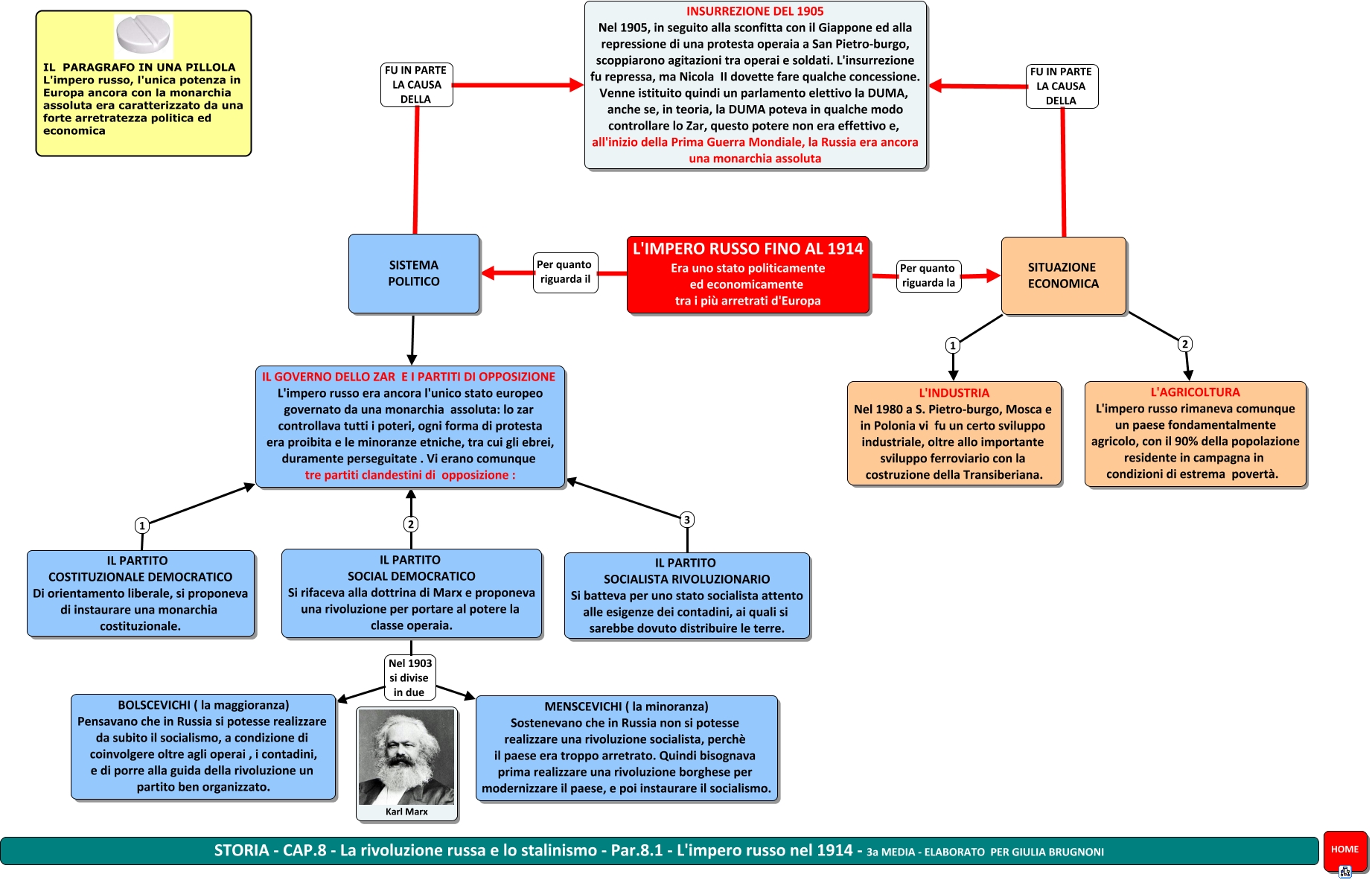 Questa Cmap, creata con IHMC CmapTools, contiene informazioni relative a: STORIA - Par.8.1 - L'impero russo nel 1914 - GB 3a media, SITUAZIONE ECONOMICA 2 L'AGRICOLTURA L'impero russo rimaneva comunque un paese fondamentalmente agricolo, con il 90% della popolazione residente in campagna in condizioni di estrema povertà., SITUAZIONE ECONOMICA FU IN PARTE LA CAUSA DELLA INSURREZIONE DEL 1905 Nel 1905, in seguito alla sconfitta con il Giappone ed alla repressione di una protesta operaia a San Pietro-burgo, scoppiarono agitazioni tra operai e soldati. L'insurrezione fu repressa, ma Nicola II dovette fare qualche concessione. Venne istituito quindi un parlamento elettivo la DUMA, anche se, in teoria, la DUMA poteva in qualche modo controllare lo Zar, questo potere non era effettivo e, all'inizio della Prima Guerra Mondiale, la Russia era ancora una monarchia assoluta, IL PARTITO SOCIALISTA RIVOLUZIONARIO Si batteva per uno stato socialista attento alle esigenze dei contadini, ai quali si sarebbe dovuto distribuire le terre. 3 IL GOVERNO DELLO ZAR E I PARTITI DI OPPOSIZIONE L'impero russo era ancora l'unico stato europeo governato da una monarchia assoluta: lo zar controllava tutti i poteri, ogni forma di protesta era proibita e le minoranze etniche, tra cui gli ebrei, duramente perseguitate . Vi erano comunque tre partiti clandestini di opposizione :, IL PARTITO SOCIAL DEMOCRATICO Si rifaceva alla dottrina di Marx e proponeva una rivoluzione per portare al potere la classe operaia. Nel 1903 si divise in due MENSCEVICHI ( la minoranza) Sostenevano che in Russia non si potesse realizzare una rivoluzione socialista, perchè il paese era troppo arretrato. Quindi bisognava prima realizzare una rivoluzione borghese per modernizzare il paese, e poi instaurare il socialismo., SISTEMA POLITICO FU IN PARTE LA CAUSA DELLA INSURREZIONE DEL 1905 Nel 1905, in seguito alla sconfitta con il Giappone ed alla repressione di una protesta operaia a San Pietro-burgo, scoppiarono agitazioni tra operai e soldati. L'insurrezione fu repressa, ma Nicola II dovette fare qualche concessione. Venne istituito quindi un parlamento elettivo la DUMA, anche se, in teoria, la DUMA poteva in qualche modo controllare lo Zar, questo potere non era effettivo e, all'inizio della Prima Guerra Mondiale, la Russia era ancora una monarchia assoluta, SISTEMA POLITICO ???? IL GOVERNO DELLO ZAR E I PARTITI DI OPPOSIZIONE L'impero russo era ancora l'unico stato europeo governato da una monarchia assoluta: lo zar controllava tutti i poteri, ogni forma di protesta era proibita e le minoranze etniche, tra cui gli ebrei, duramente perseguitate . Vi erano comunque tre partiti clandestini di opposizione :, IL PARTITO SOCIAL DEMOCRATICO Si rifaceva alla dottrina di Marx e proponeva una rivoluzione per portare al potere la classe operaia. Nel 1903 si divise in due BOLSCEVICHI ( la maggioranza) Pensavano che in Russia si potesse realizzare da subito il socialismo, a condizione di coinvolgere oltre agli operai , i contadini, e di porre alla guida della rivoluzione un partito ben organizzato., L'IMPERO RUSSO FINO AL 1914 Era uno stato politicamente ed economicamente tra i più arretrati d'Europa Per quanto riguarda la SITUAZIONE ECONOMICA, L'IMPERO RUSSO FINO AL 1914 Era uno stato politicamente ed economicamente tra i più arretrati d'Europa Per quanto riguarda il SISTEMA POLITICO, IL PARTITO SOCIAL DEMOCRATICO Si rifaceva alla dottrina di Marx e proponeva una rivoluzione per portare al potere la classe operaia. 2 IL GOVERNO DELLO ZAR E I PARTITI DI OPPOSIZIONE L'impero russo era ancora l'unico stato europeo governato da una monarchia assoluta: lo zar controllava tutti i poteri, ogni forma di protesta era proibita e le minoranze etniche, tra cui gli ebrei, duramente perseguitate . Vi erano comunque tre partiti clandestini di opposizione :, SITUAZIONE ECONOMICA 1 L'INDUSTRIA Nel 1980 a S. Pietro-burgo, Mosca e in Polonia vi fu un certo sviluppo industriale, oltre allo importante sviluppo ferroviario con la costruzione della Transiberiana., IL PARTITO COSTITUZIONALE DEMOCRATICO Di orientamento liberale, si proponeva di instaurare una monarchia costituzionale. 1 IL GOVERNO DELLO ZAR E I PARTITI DI OPPOSIZIONE L'impero russo era ancora l'unico stato europeo governato da una monarchia assoluta: lo zar controllava tutti i poteri, ogni forma di protesta era proibita e le minoranze etniche, tra cui gli ebrei, duramente perseguitate . Vi erano comunque tre partiti clandestini di opposizione :