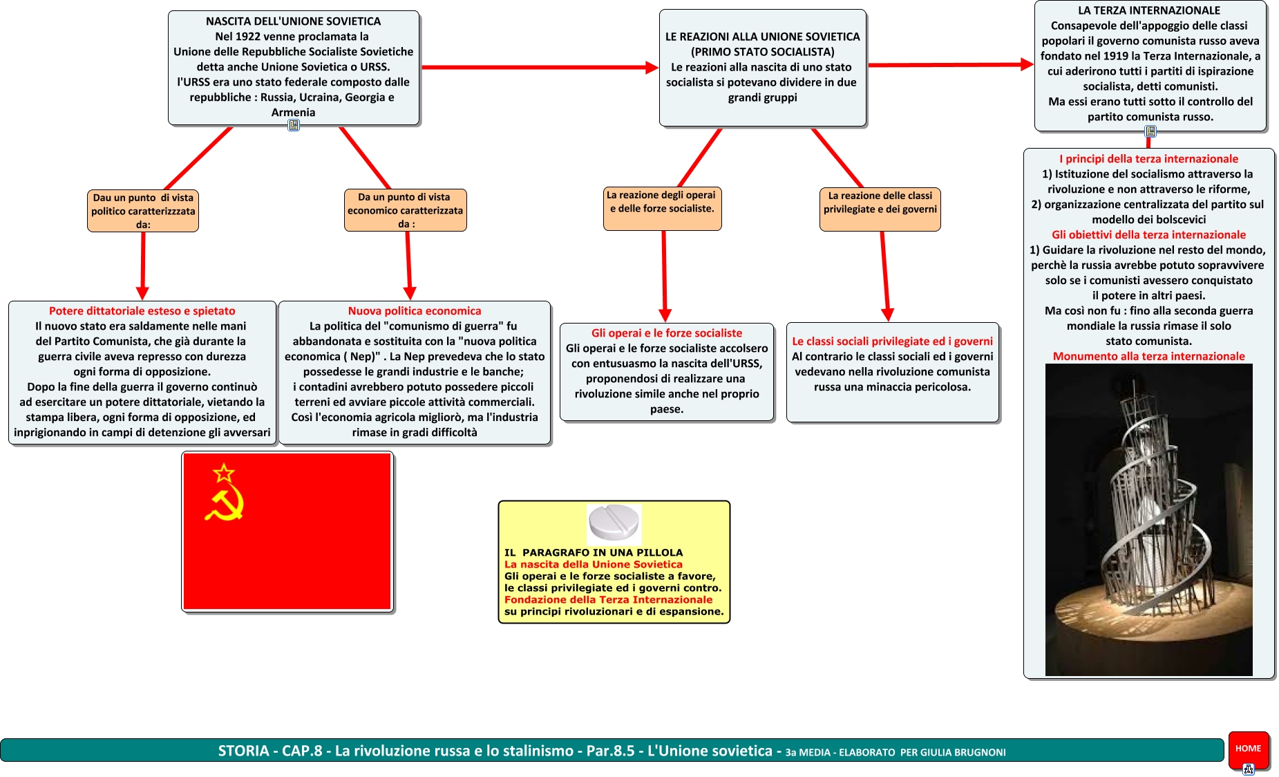 Questa Cmap, creata con IHMC CmapTools, contiene informazioni relative a: STORIA - Par.8.5 - L'Unione sovietica - GB 3a media, LA TERZA INTERNAZIONALE Consapevole dell'appoggio delle classi popolari il governo comunista russo aveva fondato nel 1919 la Terza Internazionale, a cui aderirono tutti i partiti di ispirazione socialista, detti comunisti. Ma essi erano tutti sotto il controllo del partito comunista russo. I principi e gli obiettivi della terza internazionale I principi della terza internazionale 1) Istituzione del socialismo attraverso la rivoluzione e non attraverso le riforme, 2) organizzazione centralizzata del partito sul modello dei bolscevici Gli obiettivi della terza internazionale 1) Guidare la rivoluzione nel resto del mondo, perchè la russia avrebbe potuto sopravvivere solo se i comunisti avessero conquistato il potere in altri paesi. Ma così non fu : fino alla seconda guerra mondiale la russia rimase il solo stato comunista. Monumento alla terza internazionale, NASCITA DELL'UNIONE SOVIETICA Nel 1922 venne proclamata la Unione delle Repubbliche Socialiste Sovietiche detta anche Unione Sovietica o URSS. l'URSS era uno stato federale composto dalle repubbliche : Russia, Ucraina, Georgia e Armenia ???? LE REAZIONI ALLA UNIONE SOVIETICA (PRIMO STATO SOCIALISTA) Le reazioni alla nascita di uno stato socialista si potevano dividere in due grandi gruppi, NASCITA DELL'UNIONE SOVIETICA Nel 1922 venne proclamata la Unione delle Repubbliche Socialiste Sovietiche detta anche Unione Sovietica o URSS. l'URSS era uno stato federale composto dalle repubbliche : Russia, Ucraina, Georgia e Armenia Da un punto di vista economico caratterizzata da : Nuova politica economica La politica del "comunismo di guerra" fu abbandonata e sostituita con la "nuova politica economica ( Nep)" . La Nep prevedeva che lo stato possedesse le grandi industrie e le banche; i contadini avrebbero potuto possedere piccoli terreni ed avviare piccole attività commerciali. Così l'economia agricola migliorò, ma l'industria rimase in gradi difficoltà, NASCITA DELL'UNIONE SOVIETICA Nel 1922 venne proclamata la Unione delle Repubbliche Socialiste Sovietiche detta anche Unione Sovietica o URSS. l'URSS era uno stato federale composto dalle repubbliche : Russia, Ucraina, Georgia e Armenia Dau un punto di vista politico caratterizzzata da: Potere dittatoriale esteso e spietato Il nuovo stato era saldamente nelle mani del Partito Comunista, che già durante la guerra civile aveva represso con durezza ogni forma di opposizione. Dopo la fine della guerra il governo continuò ad esercitare un potere dittatoriale, vietando la stampa libera, ogni forma di opposizione, ed inprigionando in campi di detenzione gli avversari, LE REAZIONI ALLA UNIONE SOVIETICA (PRIMO STATO SOCIALISTA) Le reazioni alla nascita di uno stato socialista si potevano dividere in due grandi gruppi ???? LA TERZA INTERNAZIONALE Consapevole dell'appoggio delle classi popolari il governo comunista russo aveva fondato nel 1919 la Terza Internazionale, a cui aderirono tutti i partiti di ispirazione socialista, detti comunisti. Ma essi erano tutti sotto il controllo del partito comunista russo., LE REAZIONI ALLA UNIONE SOVIETICA (PRIMO STATO SOCIALISTA) Le reazioni alla nascita di uno stato socialista si potevano dividere in due grandi gruppi La reazione degli operai e delle forze socialiste. Gli operai e le forze socialiste Gli operai e le forze socialiste accolsero con entusuasmo la nascita dell'URSS, proponendosi di realizzare una rivoluzione simile anche nel proprio paese., LE REAZIONI ALLA UNIONE SOVIETICA (PRIMO STATO SOCIALISTA) Le reazioni alla nascita di uno stato socialista si potevano dividere in due grandi gruppi La reazione delle classi privilegiate e dei governi Le classi sociali privilegiate ed i governi Al contrario le classi sociali ed i governi vedevano nella rivoluzione comunista russa una minaccia pericolosa.