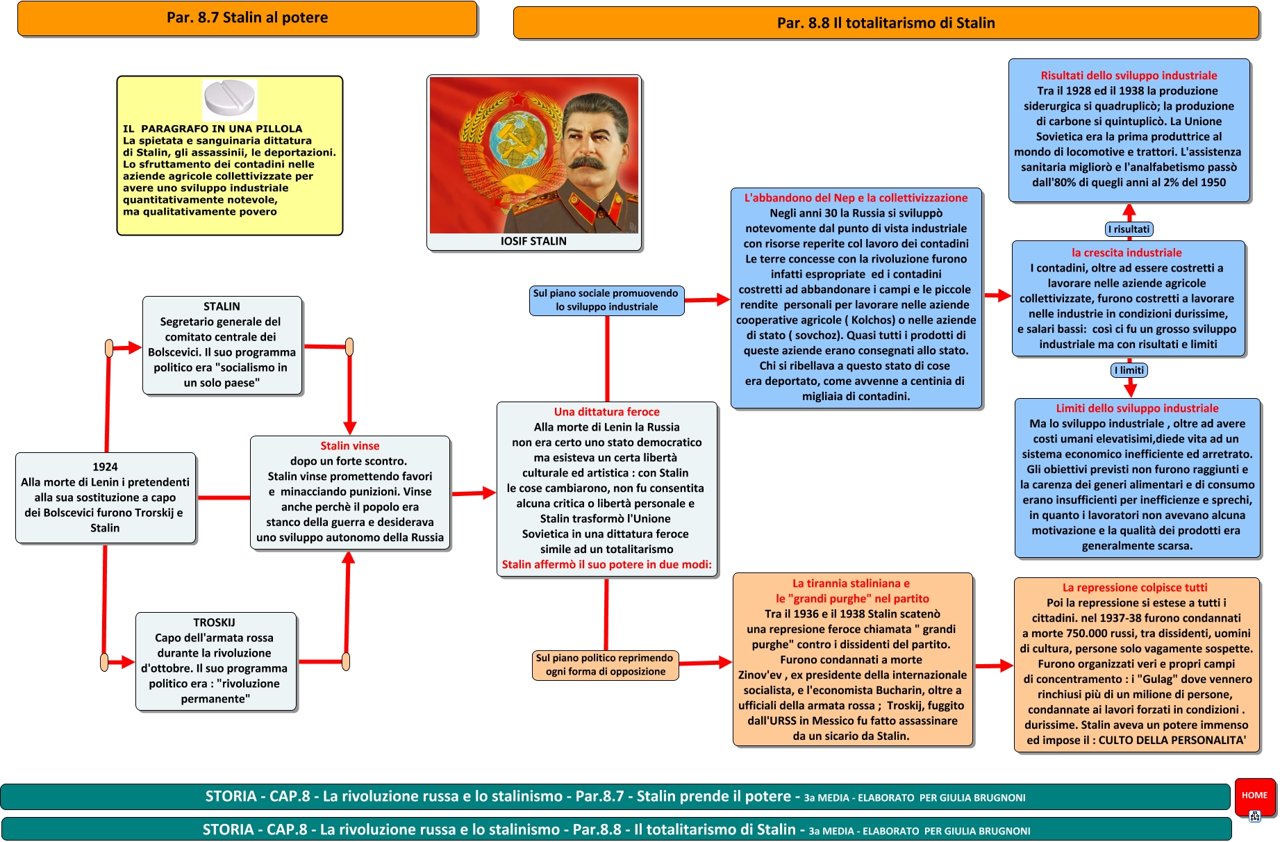 Questa Cmap, creata con IHMC CmapTools, contiene informazioni relative a: STORIA - Par.8.7 - Stalin prende il potere - Par.8.8 - Il totalitarismo di Stalin - GB 3a media, 1924 Alla morte di Lenin i pretendenti alla sua sostituzione a capo dei Bolscevici furono Trorskij e Stalin STALIN Segretario generale del comitato centrale dei Bolscevici. Il suo programma politico era "socialismo in un solo paese", 1924 Alla morte di Lenin i pretendenti alla sua sostituzione a capo dei Bolscevici furono Trorskij e Stalin TROSKIJ Capo dell'armata rossa durante la rivoluzione d'ottobre. Il suo programma politico era : "rivoluzione permanente", TROSKIJ Capo dell'armata rossa durante la rivoluzione d'ottobre. Il suo programma politico era : "rivoluzione permanente" Stalin vinse dopo un forte scontro. Stalin vinse promettendo favori e minacciando punizioni. Vinse anche perchè il popolo era stanco della guerra e desiderava uno sviluppo autonomo della Russia, Una dittatura feroce Alla morte di Lenin la Russia non era certo uno stato democratico ma esisteva un certa libertà culturale ed artistica : con Stalin le cose cambiarono, non fu consentita alcuna critica o libertà personale e Stalin trasformò l'Unione Sovietica in una dittatura feroce simile ad un totalitarismo Stalin affermò il suo potere in due modi: Sul piano sociale promuovendo lo sviluppo industriale L'abbandono del Nep e la collettivizzazione Negli anni 30 la Russia si sviluppò notevomente dal punto di vista industriale con risorse reperite col lavoro dei contadini Le terre concesse con la rivoluzione furono infatti espropriate ed i contadini costretti ad abbandonare i campi e le piccole rendite personali per lavorare nelle aziende cooperative agricole ( Kolchos) o nelle aziende di stato ( sovchoz). Quasi tutti i prodotti di queste aziende erano consegnati allo stato. Chi si ribellava a questo stato di cose era deportato, come avvenne a centinia di migliaia di contadini., La tirannia staliniana e le "grandi purghe" nel partito Tra il 1936 e il 1938 Stalin scatenò una represione feroce chiamata " grandi purghe" contro i dissidenti del partito. Furono condannati a morte Zinov'ev , ex presidente della internazionale socialista, e l'economista Bucharin, oltre a ufficiali della armata rossa ; Troskij, fuggito dall'URSS in Messico fu fatto assassinare da un sicario da Stalin. ???? La repressione colpisce tutti Poi la repressione si estese a tutti i cittadini. nel 1937-38 furono condannati a morte 750.000 russi, tra dissidenti, uomini di cultura, persone solo vagamente sospette. Furono organizzati veri e propri campi di concentramento : i "Gulag" dove vennero rinchiusi più di un milione di persone, condannate ai lavori forzati in condizioni . durissime. Stalin aveva un potere immenso ed impose il : CULTO DELLA PERSONALITA', L'abbandono del Nep e la collettivizzazione Negli anni 30 la Russia si sviluppò notevomente dal punto di vista industriale con risorse reperite col lavoro dei contadini Le terre concesse con la rivoluzione furono infatti espropriate ed i contadini costretti ad abbandonare i campi e le piccole rendite personali per lavorare nelle aziende cooperative agricole ( Kolchos) o nelle aziende di stato ( sovchoz). Quasi tutti i prodotti di queste aziende erano consegnati allo stato. Chi si ribellava a questo stato di cose era deportato, come avvenne a centinia di migliaia di contadini. ???? la crescita industriale I contadini, oltre ad essere costretti a lavorare nelle aziende agricole collettivizzate, furono costretti a lavorare nelle industrie in condizioni durissime, e salari bassi: così ci fu un grosso sviluppo industriale ma con risultati e limiti, la crescita industriale I contadini, oltre ad essere costretti a lavorare nelle aziende agricole collettivizzate, furono costretti a lavorare nelle industrie in condizioni durissime, e salari bassi: così ci fu un grosso sviluppo industriale ma con risultati e limiti I limiti Limiti dello sviluppo industriale Ma lo sviluppo industriale , oltre ad avere costi umani elevatisimi,diede vita ad un sistema economico inefficiente ed arretrato. Gli obiettivi previsti non furono raggiunti e la carenza dei generi alimentari e di consumo erano insufficienti per inefficienze e sprechi, in quanto i lavoratori non avevano alcuna motivazione e la qualità dei prodotti era generalmente scarsa., 1924 Alla morte di Lenin i pretendenti alla sua sostituzione a capo dei Bolscevici furono Trorskij e Stalin ???? Una dittatura feroce Alla morte di Lenin la Russia non era certo uno stato democratico ma esisteva un certa libertà culturale ed artistica : con Stalin le cose cambiarono, non fu consentita alcuna critica o libertà personale e Stalin trasformò l'Unione Sovietica in una dittatura feroce simile ad un totalitarismo Stalin affermò il suo potere in due modi:, la crescita industriale I contadini, oltre ad essere costretti a lavorare nelle aziende agricole collettivizzate, furono costretti a lavorare nelle industrie in condizioni durissime, e salari bassi: così ci fu un grosso sviluppo industriale ma con risultati e limiti I risultati Risultati dello sviluppo industriale Tra il 1928 ed il 1938 la produzione siderurgica si quadruplicò; la produzione di carbone si quintuplicò. La Unione Sovietica era la prima produttrice al mondo di locomotive e trattori. L'assistenza sanitaria migliorò e l'analfabetismo passò dall'80% di quegli anni al 2% del 1950, STALIN Segretario generale del comitato centrale dei Bolscevici. Il suo programma politico era "socialismo in un solo paese" Stalin vinse dopo un forte scontro. Stalin vinse promettendo favori e minacciando punizioni. Vinse anche perchè il popolo era stanco della guerra e desiderava uno sviluppo autonomo della Russia, Una dittatura feroce Alla morte di Lenin la Russia non era certo uno stato democratico ma esisteva un certa libertà culturale ed artistica : con Stalin le cose cambiarono, non fu consentita alcuna critica o libertà personale e Stalin tra