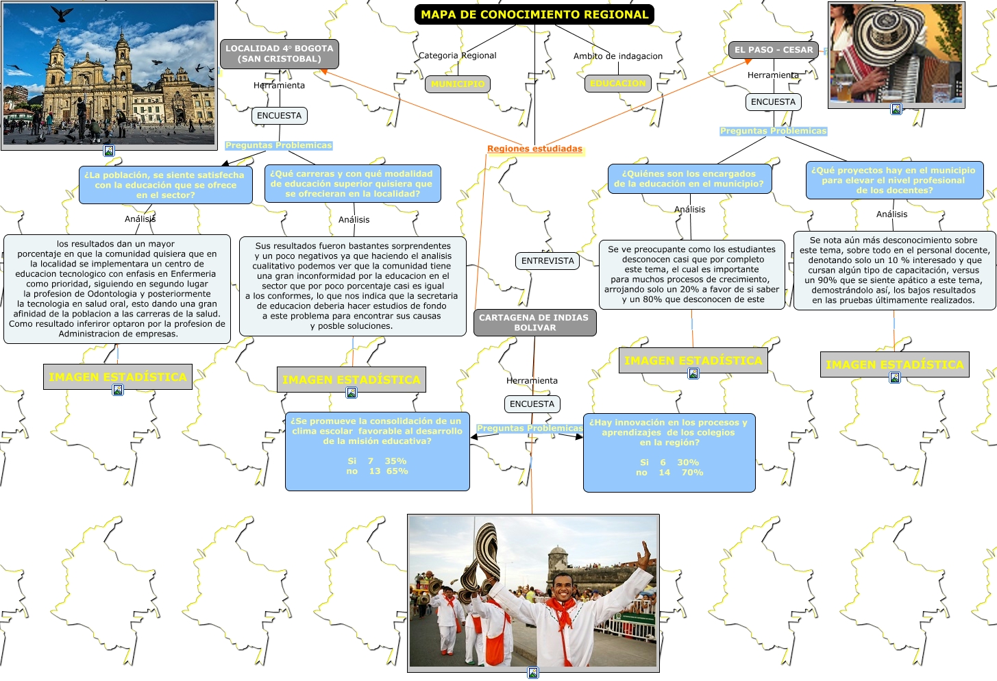 Este Cmap, tiene información relacionada con: MAPA CONOCIMIENTO REGIONAL GRUPO 712001_15 UNAD, ENCUESTA Preguntas Problemicas ¿La población, se siente satisfecha con la educación que se ofrece en el sector?, Se nota aún más desconocimiento sobre este tema, sobre todo en el personal docente, denotando solo un 10 % interesado y que cursan algún tipo de capacitación, versus un 90% que se siente apático a este tema, demostrándolo así, los bajos resultados en las pruebas últimamente realizados. IMAGEN ESTADÍSTICA, LOCALIDAD 4° BOGOTA (SAN CRISTOBAL) ????, ¿Qué carreras y con qué modalidad de educación superior quisiera que se ofrecieran en la localidad? Análisis Sus resultados fueron bastantes sorprendentes y un poco negativos ya que haciendo el analisis cualitativo podemos ver que la comunidad tiene una gran inconformidad por la educacion en el sector que por poco porcentaje casi es igual a los conformes, lo que nos indica que la secretaria de educacion deberia hacer estudios de fondo a este problema para encontrar sus causas y posble soluciones., MAPA DE CONOCIMIENTO REGIONAL Regiones estudiadas CARTAGENA DE INDIAS BOLIVAR, CARTAGENA DE INDIAS BOLIVAR Herramienta ENCUESTA, MAPA DE CONOCIMIENTO REGIONAL Regiones estudiadas LOCALIDAD 4° BOGOTA (SAN CRISTOBAL), ENCUESTA Preguntas Problemicas ¿Qué proyectos hay en el municipio para elevar el nivel profesional de los docentes?, ¿Quiénes son los encargados de la educación en el municipio? Análisis Se ve preocupante como los estudiantes desconocen casi que por completo este tema, el cual es importante para muchos procesos de crecimiento, arrojando solo un 20% a favor de si saber y un 80% que desconocen de este, los resultados dan un mayor porcentaje en que la comunidad quisiera que en la localidad se implementara un centro de educacion tecnologico con enfasis en Enfermeria como prioridad, siguiendo en segundo lugar la profesion de Odontologia y posteriormente la tecnologia en salud oral, esto dando una gran afinidad de la poblacion a las carreras de la salud. Como resultado inferiror optaron por la profesion de Administracion de empresas. IMAGEN ESTADÍSTICA, ENCUESTA Preguntas Problemicas ¿Qué carreras y con qué modalidad de educación superior quisiera que se ofrecieran en la localidad?, MAPA DE CONOCIMIENTO REGIONAL Categoria Regional MUNICIPIO, Se ve preocupante como los estudiantes desconocen casi que por completo este tema, el cual es importante para muchos procesos de crecimiento, arrojando solo un 20% a favor de si saber y un 80% que desconocen de este IMAGEN ESTADÍSTICA, MAPA DE CONOCIMIENTO REGIONAL Ambito de indagacion EDUCACION, EL PASO - CESAR Herramienta ENCUESTA, CARTAGENA DE INDIAS BOLIVAR, ¿Qué proyectos hay en el municipio para elevar el nivel profesional de los docentes? Análisis Se nota aún más desconocimiento sobre este tema, sobre todo en el personal docente, denotando solo un 10 % interesado y que cursan algún tipo de capacitación, versus un 90% que se siente apático a este tema, demostrándolo así, los bajos resultados en las pruebas últimamente realizados., MAPA DE CONOCIMIENTO REGIONAL Regiones estudiadas EL PASO - CESAR, LOCALIDAD 4° BOGOTA (SAN CRISTOBAL) Herramienta ENCUESTA, ENCUESTA Preguntas Problemicas ¿Quiénes son los encargados de la educación en el municipio?
