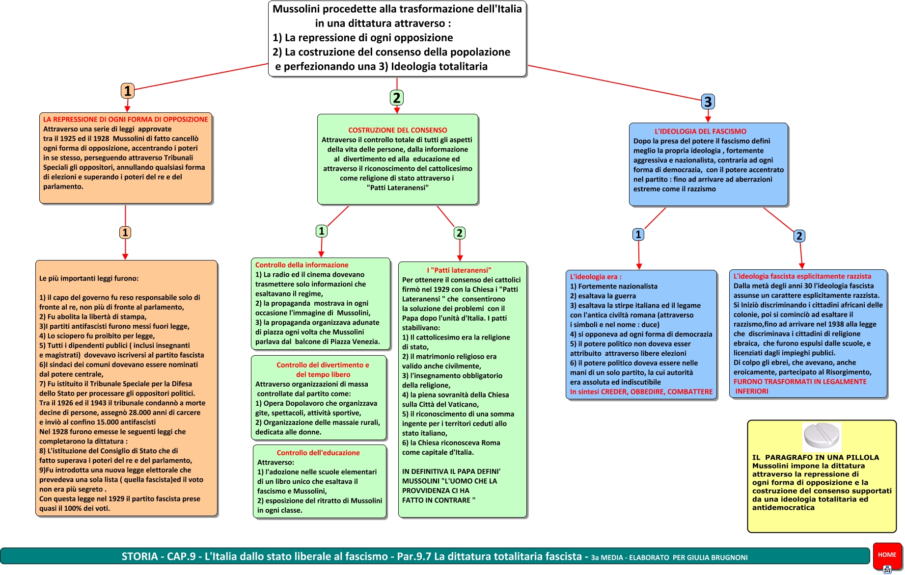 Questa Cmap, creata con IHMC CmapTools, contiene informazioni relative a: STORIA - Par.9.7 - La dittatura totalitaria fascista - GB 3a media, LA REPRESSIONE DI OGNI FORMA DI OPPOSIZIONE Attraverso una serie di leggi approvate tra il 1925 ed il 1928 Mussolini di fatto cancellò ogni forma di opposizione, accentrando i poteri in se stesso, perseguendo attraverso Tribunali Speciali gli oppositori, annullando qualsiasi forma di elezioni e superando i poteri del re e del parlamento. 1 Le più importanti leggi furono: 1) il capo del governo fu reso responsabile solo di fronte al re, non più di fronte al parlamento, 2) Fu abolita la libertà di stampa, 3)I partiti antifascisti furono messi fuori legge, 4) Lo sciopero fu proibito per legge, 5) Tutti i dipendenti publici ( inclusi insegnanti e magistrati) dovevavo iscriversi al partito fascista 6)I sindaci dei comuni dovevano essere nominati dal potere centrale, 7) Fu istituito il Tribunale Speciale per la Difesa dello Stato per processare gli oppositori politici. Tra il 1926 ed il 1943 il tribunale condannò a morte decine di persone, assegnò 28.000 anni di carcere e inviò al confino 15.000 antifascisti Nel 1928 furono emesse le seguenti leggi che completarono la dittatura : 8) L'istituzione del Consiglio di Stato che di fatto superava i poteri del re e del parlamento, 9)Fu introdotta una nuova legge elettorale che prevedeva una sola lista ( quella fascista)ed il voto non era più segreto . Con questa legge nel 1929 il partito fascista prese quasi il 100% dei voti., Mussolini procedette alla trasformazione dell'Italia in una dittatura attraverso : 1) La repressione di ogni opposizione 2) La costruzione del consenso della popolazione e perfezionando una 3) Ideologia totalitaria 1 LA REPRESSIONE DI OGNI FORMA DI OPPOSIZIONE Attraverso una serie di leggi approvate tra il 1925 ed il 1928 Mussolini di fatto cancellò ogni forma di opposizione, accentrando i poteri in se stesso, perseguendo attraverso Tribunali Speciali gli oppositori, annullando qualsiasi forma di elezioni e superando i poteri del re e del parlamento., L'IDEOLOGIA DEL FASCISMO Dopo la presa del potere il fascismo definì meglio la propria ideologia , fortemente aggressiva e nazionalista, contraria ad ogni forma di democrazia, con il potere accentrato nel partito : fino ad arrivare ad aberrazioni estreme come il razzismo 2 L'ideologia fascista esplicitamente razzista Dalla metà degli anni 30 l'ideologia fascista assunse un carattere esplicitamente razzista. Si Iniziò discriminando i cittadini africani delle colonie, poi si cominciò ad esaltare il razzismo,fino ad arrivare nel 1938 alla legge che discriminava i cittadini di religione ebraica, che furono espulsi dalle scuole, e licenziati dagli impieghi publici. Di colpo gli ebrei, che avevano, anche eroicamente, partecipato al Risorgimento, FURONO TRASFORMATI IN LEGALMENTE INFERIORI, L'IDEOLOGIA DEL FASCISMO Dopo la presa del potere il fascismo definì meglio la propria ideologia , fortemente aggressiva e nazionalista, contraria ad ogni forma di democrazia, con il potere accentrato nel partito : fino ad arrivare ad aberrazioni estreme come il razzismo 1 L'ideologia era : 1) Fortemente nazionalista 2) esaltava la guerra 3) esaltava la stirpe italiana ed il legame con l'antica civiltà romana (attraverso i simboli e nel nome : duce) 4) si opponeva ad ogni forma di democrazia 5) il potere politico non doveva esser attribuito attraverso libere elezioni 6) il potere politico doveva essere nelle mani di un solo partito, la cui autorità era assoluta ed indiscutibile In sintesi CREDER, OBBEDIRE, COMBATTERE, COSTRUZIONE DEL CONSENSO Attraverso il controllo totale di tutti gli aspetti della vita delle persone, dalla informazione al divertimento ed alla educazione ed attraverso il riconoscimento del cattolicesimo come religione di stato attraverso i "Patti Lateranensi" 2 I "Patti lateranensi" Per ottenere il consenso dei cattolici firmò nel 1929 con la Chiesa i "Patti Lateranensi " che consentirono la soluzione dei problemi con il Papa dopo l'unità d'Italia. I patti stabilivano: 1) Il cattolicesimo era la religione di stato, 2) il matrimonio religioso era valido anche civilmente, 3) l'insegnamento obbligatorio della religione, 4) la piena sovranità della Chiesa sulla Città del Vaticano, 5) il riconoscimento di una somma ingente per i territori ceduti allo stato italiano, 6) la Chiesa riconosceva Roma come capitale d'Italia. IN DEFINITIVA IL PAPA DEFINI' MUSSOLINI "L'UOMO CHE LA PROVVIDENZA CI HA FATTO IN CONTRARE ", COSTRUZIONE DEL CONSENSO Attraverso il controllo totale di tutti gli aspetti della vita delle persone, dalla informazione al divertimento ed alla educazione ed attraverso il riconoscimento del cattolicesimo come religione di stato attraverso i "Patti Lateranensi" 1 Controllo della informazione 1) La radio ed il cinema dovevano trasmettere solo informazioni che esaltavano il regime, 2) la propaganda mostrava in ogni occasione l'immagine di Mussolini, 3) la propaganda organizzava adunate di piazza ogni volta che Mussolini parlava dal balcone di Piazza Venezia., Mussolini procedette alla trasformazione dell'Italia in una dittatura attraverso : 1) La repressione di ogni opposizione 2) La costruzione del consenso della popolazione e perfezionando una 3) Ideologia totalitaria 2 COSTRUZIONE DEL CONSENSO Attraverso il controllo totale di tutti gli aspetti della vita delle persone, dalla informazione al divertimento ed alla educazione ed attraverso il riconoscimento del cattolicesimo come religione di stato attraverso i "Patti Lateranensi", Mussolini procedette alla trasformazione dell'Italia in una dittatura attraverso : 1) La repressione di ogni opposizione 2) La costruzione del consenso della popolazione e perfezionando una 3) Ideologia totalitaria 3 L'IDEOLOGIA DEL FASCISMO Dopo la presa del potere il fascismo definì meglio la propria ideologia , fortemente aggressiva e nazionalista, contraria ad ogni forma di democrazia, con i