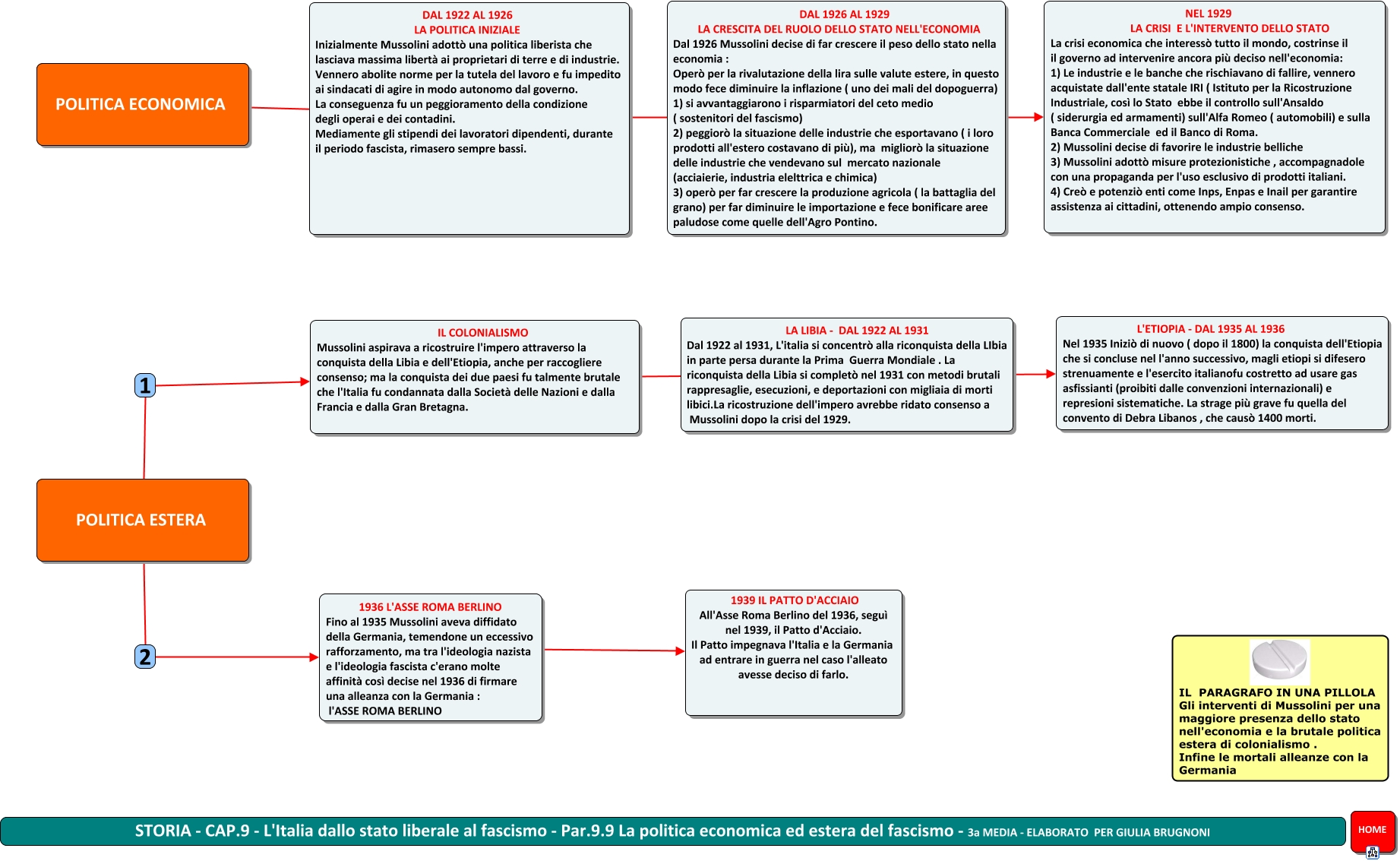 Questa Cmap, creata con IHMC CmapTools, contiene informazioni relative a: STORIA - Par.9.9 - La politica economica ed estera del fascismo - GB 3a media, 1936 L'ASSE ROMA BERLINO Fino al 1935 Mussolini aveva diffidato della Germania, temendone un eccessivo rafforzamento, ma tra l'ideologia nazista e l'ideologia fascista c'erano molte affinità così decise nel 1936 di firmare una alleanza con la Germania : l'ASSE ROMA BERLINO ???? 1939 IL PATTO D'ACCIAIO All'Asse Roma Berlino del 1936, seguì nel 1939, il Patto d'Acciaio. Il Patto impegnava l'Italia e la Germania ad entrare in guerra nel caso l'alleato avesse deciso di farlo., IL COLONIALISMO Mussolini aspirava a ricostruire l'impero attraverso la conquista della Libia e dell'Etiopia, anche per raccogliere consenso; ma la conquista dei due paesi fu talmente brutale che l'Italia fu condannata dalla Società delle Nazioni e dalla Francia e dalla Gran Bretagna. ???? L'ETIOPIA - DAL 1935 AL 1936 Nel 1935 Iniziò di nuovo ( dopo il 1800) la conquista dell'Etiopia che si concluse nel l'anno successivo, magli etiopi si difesero strenuamente e l'esercito italianofu costretto ad usare gas asfissianti (proibiti dalle convenzioni internazionali) e represioni sistematiche. La strage più grave fu quella del convento di Debra Libanos , che causò 1400 morti., POLITICA ECONOMICA ???? NEL 1929 LA CRISI E L'INTERVENTO DELLO STATO La crisi economica che interessò tutto il mondo, costrinse il il governo ad intervenire ancora più deciso nell'economia: 1) Le industrie e le banche che rischiavano di fallire, vennero acquistate dall'ente statale IRI ( Istituto per la Ricostruzione Industriale, così lo Stato ebbe il controllo sull'Ansaldo ( siderurgia ed armamenti) sull'Alfa Romeo ( automobili) e sulla Banca Commerciale ed il Banco di Roma. 2) Mussolini decise di favorire le industrie belliche 3) Mussolini adottò misure protezionistiche , accompagnadole con una propaganda per l'uso esclusivo di prodotti italiani. 4) Creò e potenziò enti come Inps, Enpas e Inail per garantire assistenza ai cittadini, ottenendo ampio consenso., POLITICA ESTERA 1 IL COLONIALISMO Mussolini aspirava a ricostruire l'impero attraverso la conquista della Libia e dell'Etiopia, anche per raccogliere consenso; ma la conquista dei due paesi fu talmente brutale che l'Italia fu condannata dalla Società delle Nazioni e dalla Francia e dalla Gran Bretagna., POLITICA ESTERA 2 1936 L'ASSE ROMA BERLINO Fino al 1935 Mussolini aveva diffidato della Germania, temendone un eccessivo rafforzamento, ma tra l'ideologia nazista e l'ideologia fascista c'erano molte affinità così decise nel 1936 di firmare una alleanza con la Germania : l'ASSE ROMA BERLINO