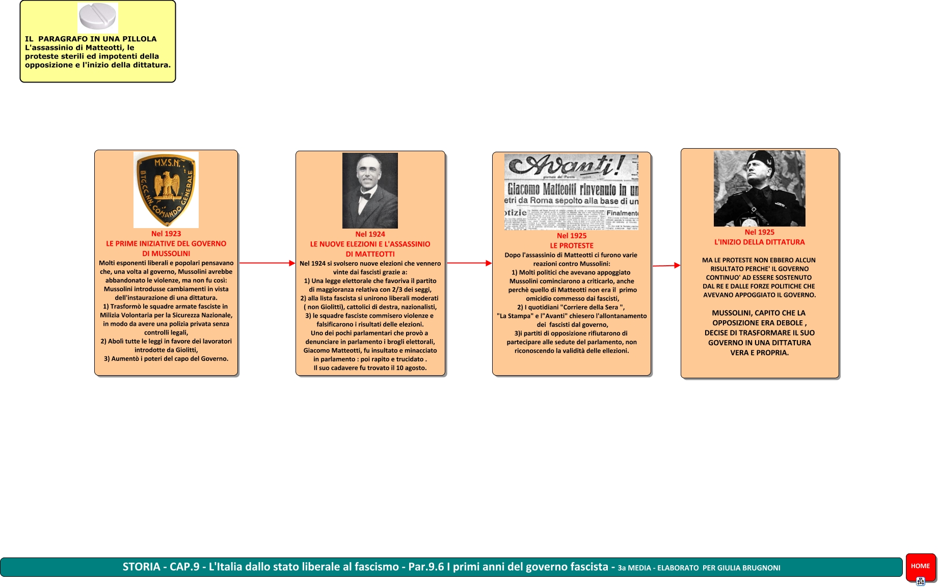 Questa Cmap, creata con IHMC CmapTools, contiene informazioni relative a: STORIA - Par.9.6 - I primi anni del governo fascista - GB 3a media, Nel 1924 LE NUOVE ELEZIONI E L'ASSASSINIO DI MATTEOTTI Nel 1924 si svolsero nuove elezioni che vennero vinte dai fascisti grazie a: 1) Una legge elettorale che favoriva il partito di maggioranza relativa con 2/3 dei seggi, 2) alla lista fascista si unirono liberali moderati ( non Giolitti), cattolici di destra, nazionalisti, 3) le squadre fasciste commisero violenze e falsificarono i risultati delle elezioni. Uno dei pochi parlamentari che provò a denunciare in parlamento i brogli elettorali, Giacomo Matteotti, fu insultato e minacciato in parlamento : poi rapito e trucidato . Il suo cadavere fu trovato il 10 agosto. ???? Nel 1925 LE PROTESTE Dopo l'assassinio di Matteotti ci furono varie reazioni contro Mussolini: 1) Molti politici che avevano appoggiato Mussolini cominciarono a criticarlo, anche perchè quello di Matteotti non era il primo omicidio commesso dai fascisti, 2) I quotidiani "Corriere della Sera ", "La Stampa" e l"Avanti" chiesero l'allontanamento dei fascisti dal governo, 3)i partiti di opposizione rifiutarono di partecipare alle sedute del parlamento, non riconoscendo la validità delle ellezioni., Nel 1923 LE PRIME INIZIATIVE DEL GOVERNO DI MUSSOLINI Molti esponenti liberali e popolari pensavano che, una volta al governo, Mussolini avrebbe abbandonato le violenze, ma non fu così: Mussolini introdusse cambiamenti in vista dell'instaurazione di una dittatura. 1) Trasformò le squadre armate fasciste in Milizia Volontaria per la Sicurezza Nazionale, in modo da avere una polizia privata senza controlli legali, 2) Abolì tutte le leggi in favore dei lavoratori introdotte da Giolitti, 3) Aumentò i poteri del capo del Governo. ???? Nel 1924 LE NUOVE ELEZIONI E L'ASSASSINIO DI MATTEOTTI Nel 1924 si svolsero nuove elezioni che vennero vinte dai fascisti grazie a: 1) Una legge elettorale che favoriva il partito di maggioranza relativa con 2/3 dei seggi, 2) alla lista fascista si unirono liberali moderati ( non Giolitti), cattolici di destra, nazionalisti, 3) le squadre fasciste commisero violenze e falsificarono i risultati delle elezioni. Uno dei pochi parlamentari che provò a denunciare in parlamento i brogli elettorali, Giacomo Matteotti, fu insultato e minacciato in parlamento : poi rapito e trucidato . Il suo cadavere fu trovato il 10 agosto., Nel 1925 LE PROTESTE Dopo l'assassinio di Matteotti ci furono varie reazioni contro Mussolini: 1) Molti politici che avevano appoggiato Mussolini cominciarono a criticarlo, anche perchè quello di Matteotti non era il primo omicidio commesso dai fascisti, 2) I quotidiani "Corriere della Sera ", "La Stampa" e l"Avanti" chiesero l'allontanamento dei fascisti dal governo, 3)i partiti di opposizione rifiutarono di partecipare alle sedute del parlamento, non riconoscendo la validità delle ellezioni. ???? Nel 1925 L'INIZIO DELLA DITTATURA MA LE PROTESTE NON EBBERO ALCUN RISULTATO PERCHE' IL GOVERNO CONTINUO' AD ESSERE SOSTENUTO DAL RE E DALLE FORZE POLITICHE CHE AVEVANO APPOGGIATO IL GOVERNO. MUSSOLINI, CAPITO CHE LA OPPOSIZIONE ERA DEBOLE , DECISE DI TRASFORMARE IL SUO GOVERNO IN UNA DITTATURA VERA E PROPRIA.