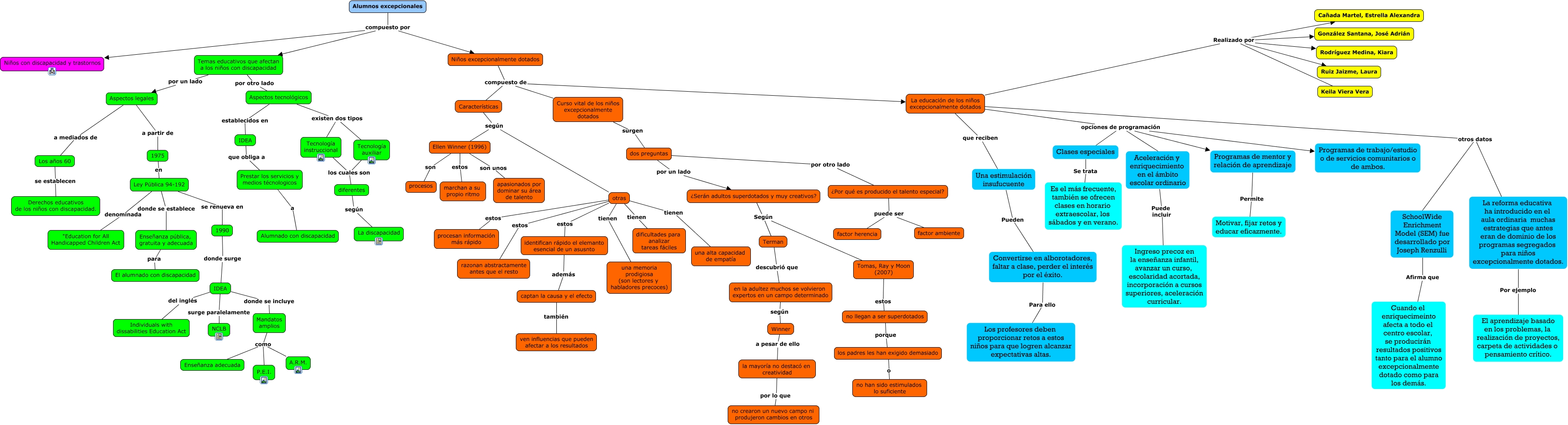 Este Cmap, tiene información relacionada con: mi parte capítulo 2 adri, IDEA del inglés Individuals with dissabilities Education Act, La reforma educativa ha introducido en el aula ordinaria muchas estrategias que antes eran de dominio de los programas segregados para niños excepcionalmente dotados. Por ejemplo El aprendizaje basado en los problemas, la realización de proyectos, carpeta de actividades o pensamiento crítico., Características según Ellen Winner (1996), Winner a pesar de ello la mayoría no destacó en creatividad, Una estimulación insufucuente Pueden Convertirse en alborotadores, faltar a clase, perder el interés por el éxito., Tecnología instruccional los cuales son diferentes, identifican rápido el elemanto esencial de un asusnto además captan la causa y el efecto, La educación de los niños excepcionalmente dotados opciones de programación Aceleración y enriquecimiento en el ámbito escolar ordinario, La educación de los niños excepcionalmente dotados opciones de programación Programas de mentor y relación de aprendizaje, Convertirse en alborotadores, faltar a clase, perder el interés por el éxito. Para ello Los profesores deben proporcionar retos a estos niños para que logren alcanzar expectativas altas., La educación de los niños excepcionalmente dotados que reciben Una estimulación insufucuente, Tecnología auxiliar los cuales son diferentes, La educación de los niños excepcionalmente dotados Realizado por Cañada Martel, Estrella Alexandra, Ley Pública 94-192 donde se establece Enseñanza pública, gratuita y adecuada, ¿Serán adultos superdotados y muy creativos? Según Tomas, Ray y Moon (2007), Los años 60 se establecen Derechos educativos de los niños con discapacidad., Prestar los servicios y medios técnologicos a Alumnado con discapacidad, IDEA donde se incluye Mandatos amplios, Alumnos excepcionales compuesto por Temas educativos que afectan a los niños con discapacidad, diferentes según La discapacidad