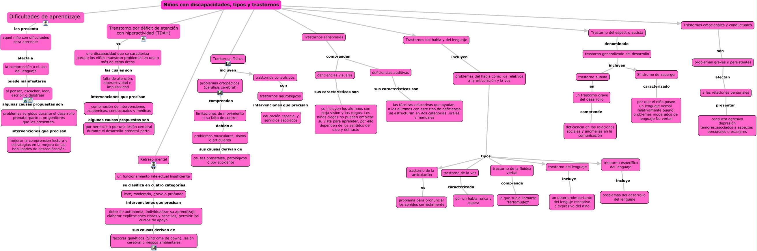 Este Cmap, tiene información relacionada con: niños con discapacidad, tipos y transtornos parte kiara y keila, Niños con discapacidades, tipos y trastornos ???? Trastornos emocionales y conductuales, Trastorno del espectro autista denominado trastorno generalizado del desarrollo, Trastornos sensoriales comprenden deficiencias visuales, un funcionamiento intelectual insuficiente se clasifica en cuatro categorías leve, moderado, grave o profundo, Transtorno por déficit de atención con hiperactividad (TDAH) ???? Niños con discapacidades, tipos y trastornos, Trastornos emocionales y conductuales son problemas graves y persistentes, trastorno específico del lenguaje incluye problemas del desarrollo del lenguaje, Niños con discapacidades, tipos y trastornos ???? Trastornos sensoriales, combinación de intervenciones académicas, conductuales y médicas algunas causas propuestas son por herencia o por una lesión cerebral durante el desarrollo prenatal-parto., trastornos neurológicos intervenciones que precisan educación especial y servicios asociados, problemas del habla como los relativos a la articulación y la voz tipos trastorno de la voz, Niños con discapacidades, tipos y trastornos ???? Trastorno del espectro autista, problemas del habla como los relativos a la articulación y la voz tipos trastorno de la fluidez verbal, problemas del habla como los relativos a la articulación y la voz tipos trastorno de la articulación, trastorno de la articulación es problema para pronunciar los sonidos correctamente, problemas surgidos durante el desarrollo prenatal-parto o progenitores que las presenten. intervenciones que precisan mejorar la comprensión lectora y estrategias en la mejora de las habilidades de descodificación., aquel niño con dificultades para aprender afecta a la comprensión o el uso del lenguaje, Trastornos físicos incluyen trastornos convulsivos, Trastornos del habla y del lenguaje incluyen problemas del habla como los relativos a la articulación y la voz, Retraso mental es un funcionamiento intelectual insuficiente