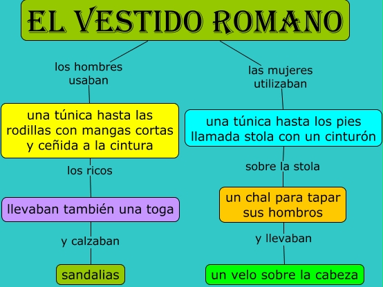 Este Cmap, tiene información relacionada con: El vestido romano, EL VESTIDO ROMANO las mujeres utilizaban una túnica hasta los pies llamada stola con un cinturón, una túnica hasta las rodillas con mangas cortas y ceñida a la cintura los ricos llevaban también una toga, EL VESTIDO ROMANO los hombres usaban una túnica hasta las rodillas con mangas cortas y ceñida a la cintura, llevaban también una toga y calzaban sandalias, un chal para tapar sus hombros y llevaban un velo sobre la cabeza, una túnica hasta los pies llamada stola con un cinturón sobre la stola un chal para tapar sus hombros