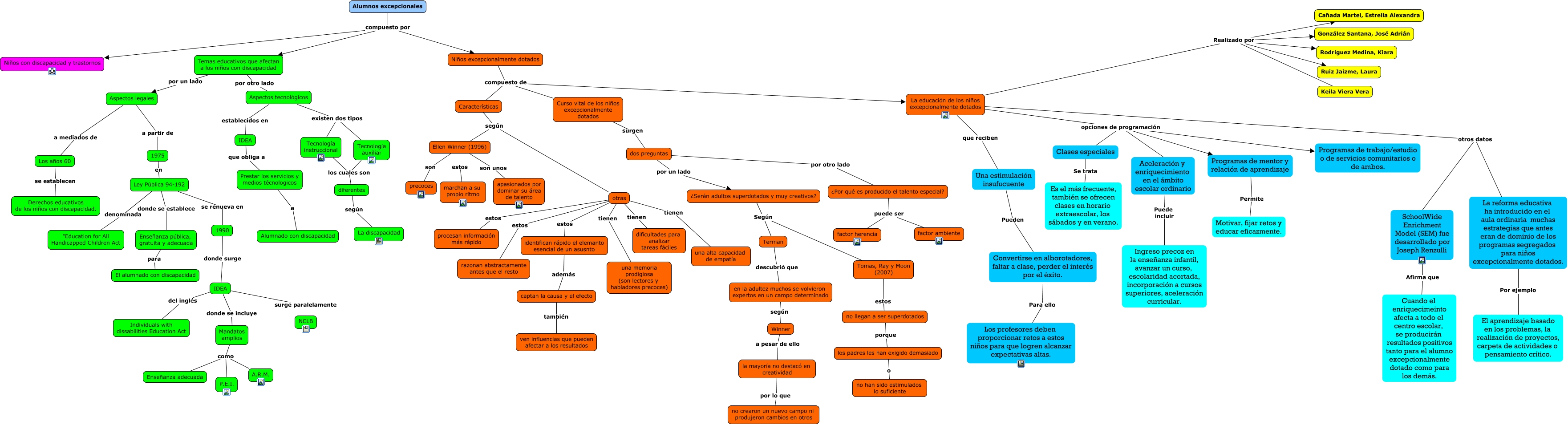 Este Cmap, tiene información relacionada con: Parte principal, otras tienen una alta capacidad de empatía, otras estos identifican rápido el elemanto esencial de un asusnto, otras tienen una memoria prodigiosa (son lectores y habladores precoces), Curso vital de los niños excepcionalmente dotados compuesto de La educación de los niños excepcionalmente dotados, captan la causa y el efecto también ven influencias que pueden afectar a los resultados, Aspectos tecnológicos establecidos en IDEA, La educación de los niños excepcionalmente dotados opciones de programación Clases especiales, Aceleración y enriquecimiento en el ámbito escolar ordinario Puede incluir Ingreso precoz en la enseñanza infantil, avanzar un curso, escolaridad acortada, incorporación a cursos superiores, aceleración curricular., Curso vital de los niños excepcionalmente dotados compuesto de Características, Niños excepcionalmente dotados compuesto de La educación de los niños excepcionalmente dotados, ¿Serán adultos superdotados y muy creativos? Según Terman, ¿Por qué es producido el talento especial? puede ser factor herencia, Alumnos excepcionales compuesto por Temas educativos que afectan a los niños con discapacidad, Ley Pública 94-192 donde se establece Enseñanza pública, gratuita y adecuada, Niños excepcionalmente dotados compuesto de Características, Tecnología auxiliar los cuales son diferentes, Temas educativos que afectan a los niños con discapacidad por otro lado Aspectos tecnológicos, Temas educativos que afectan a los niños con discapacidad por un lado Aspectos legales, Ellen Winner (1996) estos marchan a su propio ritmo, Aspectos tecnológicos existen dos tipos Tecnología auxiliar