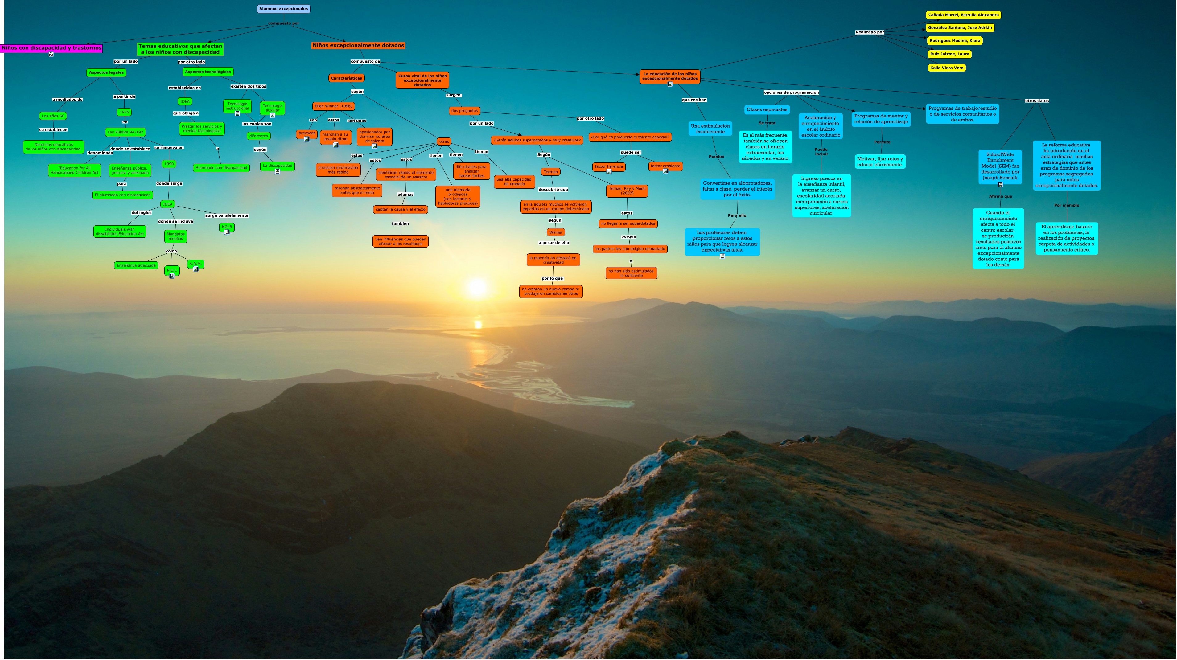 Este Cmap, tiene información relacionada con: PARTE PRINCIPAL FIN, otras tienen una alta capacidad de empatía, otras estos identifican rápido el elemanto esencial de un asusnto, otras tienen una memoria prodigiosa (son lectores y habladores precoces), Curso vital de los niños excepcionalmente dotados compuesto de La educación de los niños excepcionalmente dotados, captan la causa y el efecto también ven influencias que pueden afectar a los resultados, Aspectos tecnológicos establecidos en IDEA, La educación de los niños excepcionalmente dotados opciones de programación Clases especiales, Aceleración y enriquecimiento en el ámbito escolar ordinario Puede incluir Ingreso precoz en la enseñanza infantil, avanzar un curso, escolaridad acortada, incorporación a cursos superiores, aceleración curricular., Curso vital de los niños excepcionalmente dotados compuesto de Características, Niños excepcionalmente dotados compuesto de La educación de los niños excepcionalmente dotados, ¿Serán adultos superdotados y muy creativos? Según Terman, ¿Por qué es producido el talento especial? puede ser factor herencia, Alumnos excepcionales compuesto por Temas educativos que afectan a los niños con discapacidad, Ley Pública 94-192 donde se establece Enseñanza pública, gratuita y adecuada, Niños excepcionalmente dotados compuesto de Características, Tecnología auxiliar los cuales son diferentes, Temas educativos que afectan a los niños con discapacidad por otro lado Aspectos tecnológicos, Temas educativos que afectan a los niños con discapacidad por un lado Aspectos legales, Ellen Winner (1996) estos marchan a su propio ritmo, Aspectos tecnológicos existen dos tipos Tecnología auxiliar